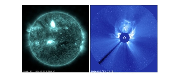 2024年3月23日SOHO卫星观测到的耀斑与日冕物质抛射。(图片来源:中科院空间环境预报中心)