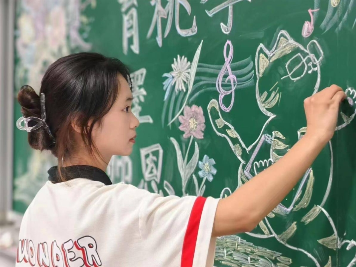 “在教师节这天,带领广大同学向老师表达敬意和感谢已经成为我们的惯例,自2021年起,从绘制板画到隧道壁画,再到装饰教学楼的台阶……四年间已有上千名同学参与其中。今年除了绘制板画,我们还专门制作了节日海报,和后勤的工作人员一起,将两校区所有教室的多媒体设备壁纸都替换了。”学校“青马工程”学员、学生会执行主席孙佳怡介绍道。