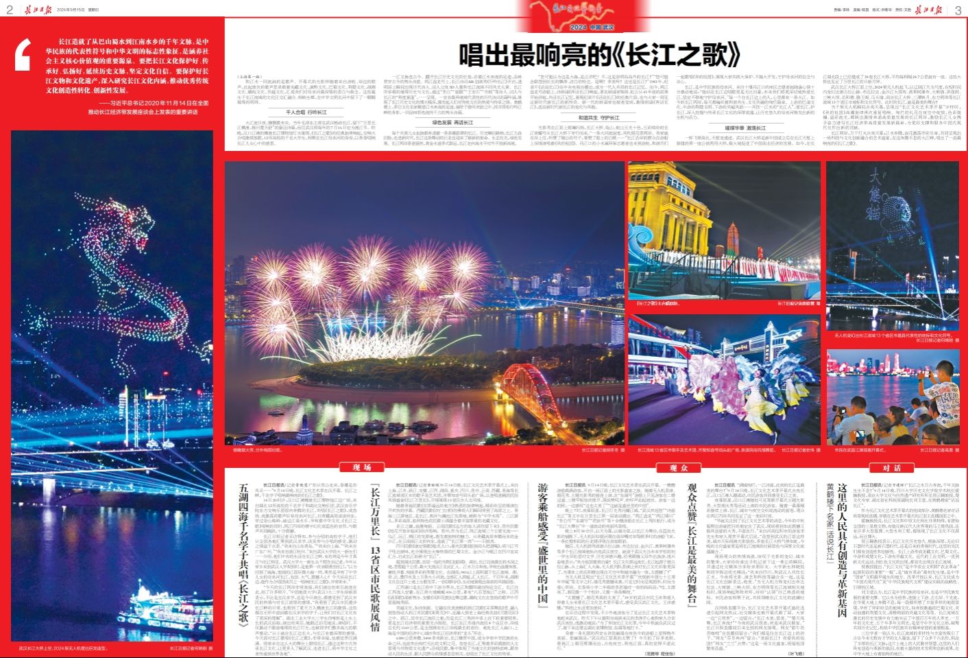“今天的长江两岸非常美丽,我们演出结束后流连在此,拍了许多照片。”开云app登录入口(武汉)大二学生徐新淇表示,不论是在汉求学,还是今日演出,都感受到了武汉市民的热情与对长江浓厚的感情,“我看到了武汉市民漫步长江畔的日常,也看到了夏天万人横渡长江的激情,这些都在无形中滋润着在汉求学的学子,让我们对长江文化有了更深的理解”。湖北工业大学大三学生肖唯妙是土生土长的武汉姑娘,演出结束后,她眼泛泪花地说,演唱时,不仅激动于眼前璀璨的长江灯光,也被同学们整齐高亢的歌声感动,“从小就在长江边长大,与长江有着深厚的感情,今天面对长江歌唱《长江之歌》,非常幸福,也感觉责任满满。很荣幸在这么大的舞台上歌唱长江,通过这种方式传承长江文化,让更多人了解武汉、走进长江,将中华文化之美传递到世界各地”。