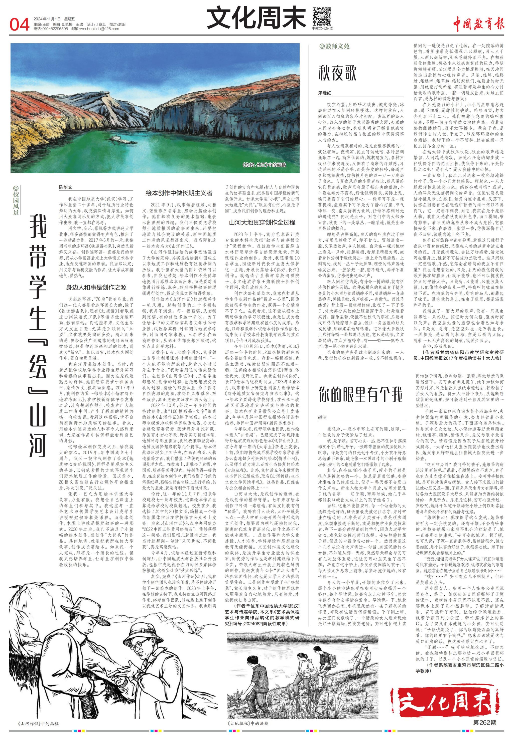 今年以来,我带领学生团队,创作绘本进入“井喷期”。已经完成了再现师生野外地质实践的彩色绘本《逐梦山河》,且在今年第十期的《大学生》杂志上发表。目前,我们即将完成再现学校专家学者服务云南施甸乡村振兴的绘本《情系山河》,以及师生助力湖北石首生态修复的绘本《大地征程》。此外,我把近五年来撰写的生态评论汇编成集,取名《山河锦绣:生态文化文学阅读手札》。这些作品,已经在与公众相会的路上……