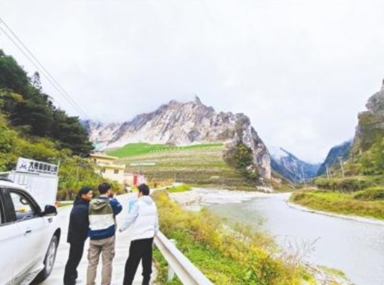 地大师生在雅安市宝兴县作地质调查,前方是高耸的汉白玉山体。