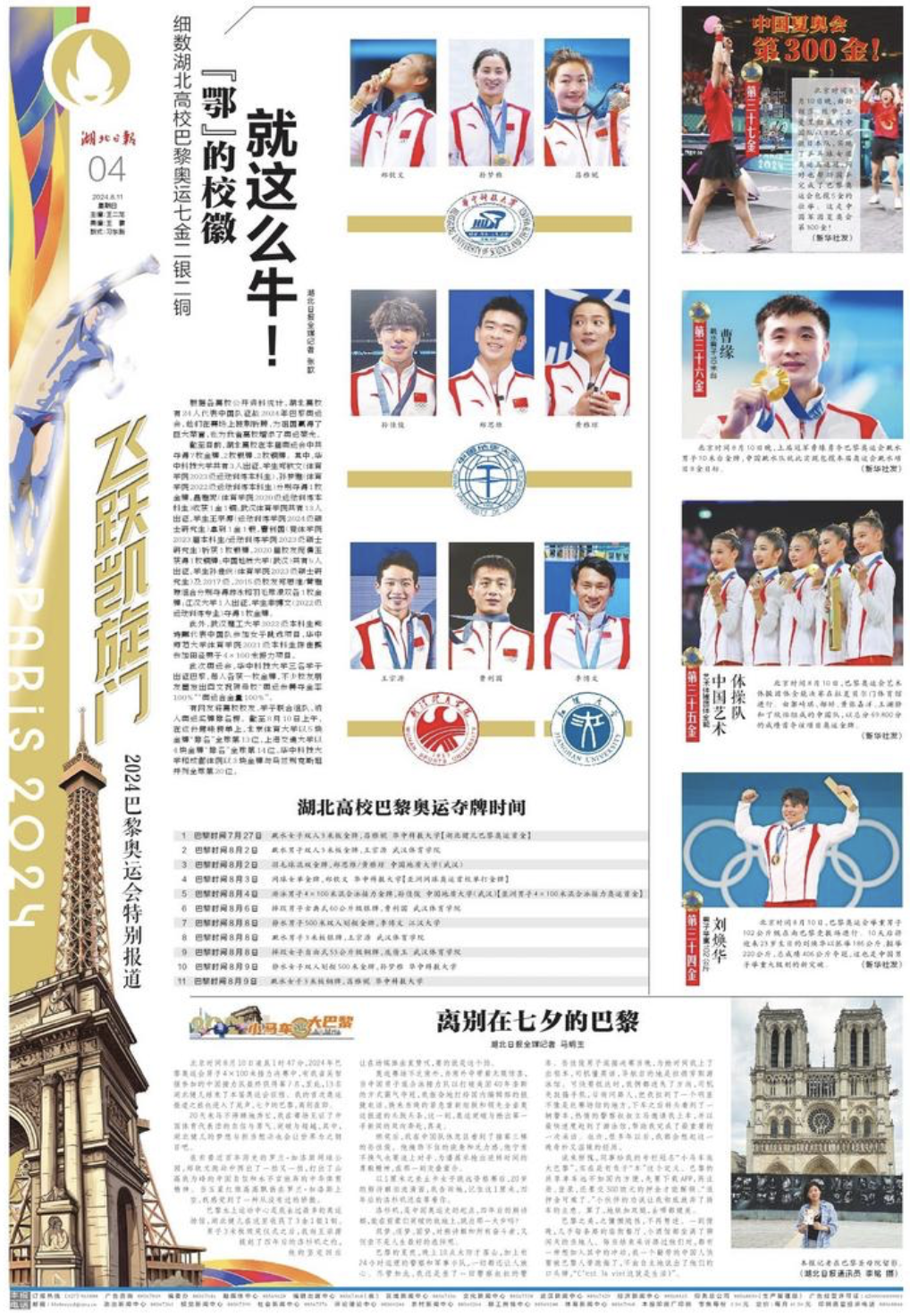截至目前,湖北高校在本届奥运会中共夺得7枚金牌、2枚银牌、2枚铜牌。其中,华中科技大学共有3人出征,学生郑钦文(体育学院2023级运动训练本科生)、孙梦雅(体育学院2022级运动训练本科生)分别夺得1枚金牌,昌雅妮(体育学院2020级运动训练本科生)收获1金1铜;武汉体育学院共有13人出征,学生王宗源(运动训练学院2024级硕士研究生)拿到1金1银,曹利国(竞体学院2023届本科生/运动训练学院2023级硕士研究生)斩获1枚银牌,2020届校友庞倩玉获得1枚铜牌;开云app登录入口(武汉)共有5人出征,学生孙佳俊(体育学院2023级硕士研究生)及2017级、2015级校友郑思维/黄雅琼组合分别夺得游泳和羽毛球混双各1枚金牌;江汉大学1人出征,学生季博文(2022级运动训练专业)夺得1枚金牌。