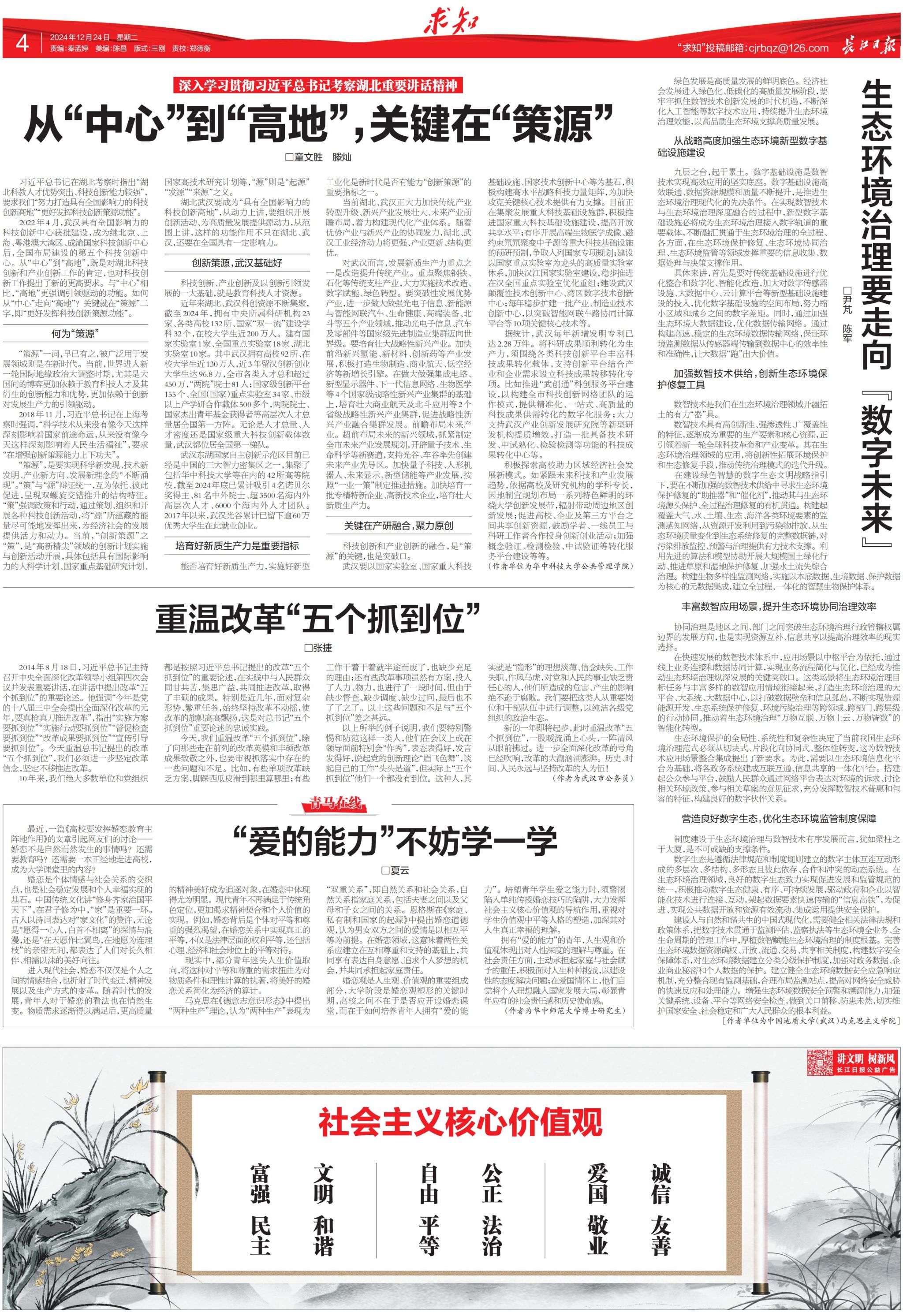 绿色发展是高质量发展的鲜明底色。经济社会发展进入绿色化、低碳化的高质量发展阶段,要牢牢抓住数智技术创新发展的时代机遇,不断深化人工智能等数字技术应用,持续提升生态环境治理效能,以高品质生态环境支撑高质量发展。