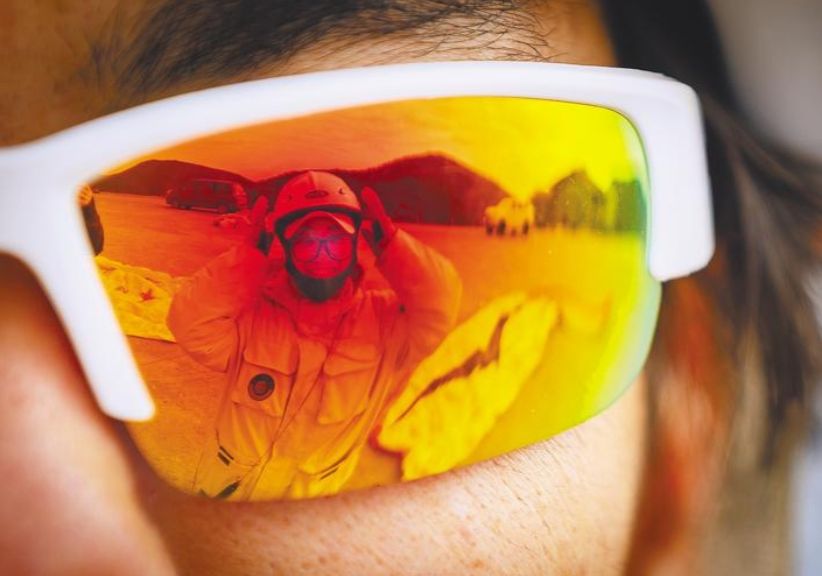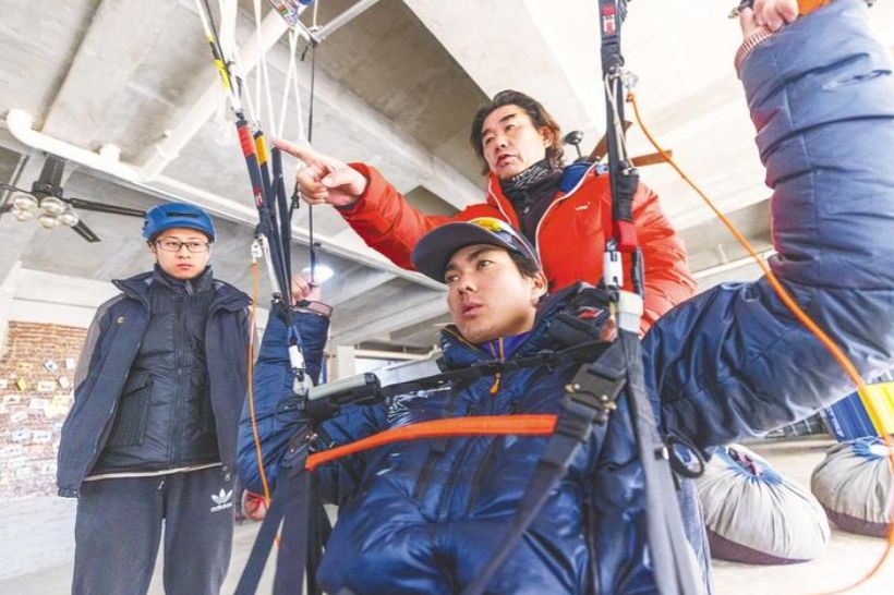2月8日,起飞前,地大学生孟晴对着队友炫酷的眼镜调整头盔。