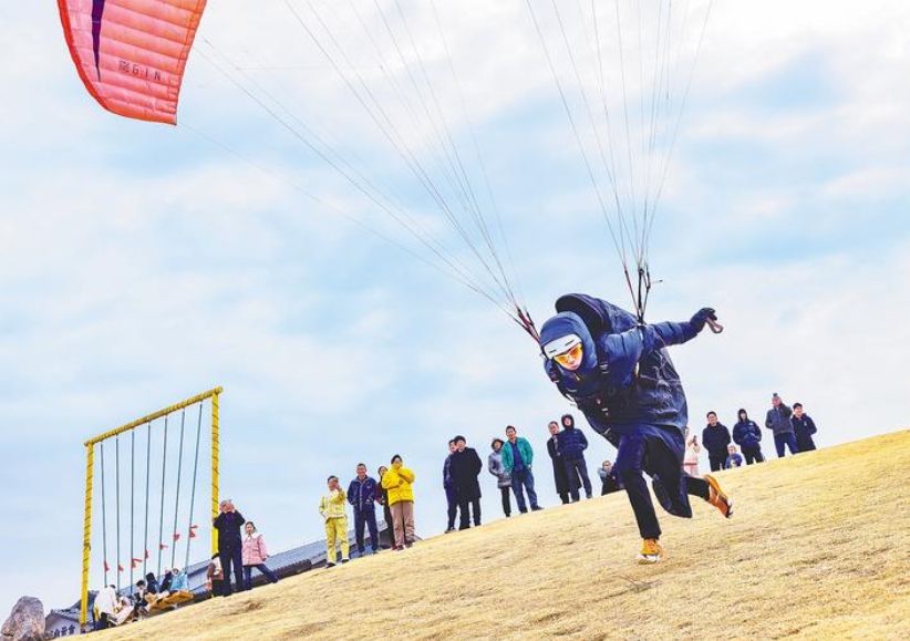 2月8日,大冶毛铺滑翔伞基地起飞场,地大学生田茂宇在村民和游客的注视下拉紧伞绳,向悬崖边奔跑、起飞。