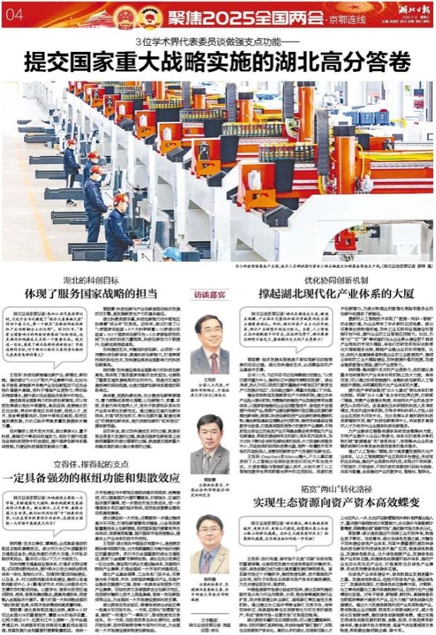 王焰新:湖北地处中国经济地理中心,是连接东部沿海与西部内陆、北方资源富集区与南方经济活跃区的重要纽带。武汉作为全国重要的综合交通枢纽,拥有“九省通衢”的鲜明优势。湖北应充分发挥这一区位优势,建设现代综合交通运输体系,发展现代物流产业集群,打造全国统一大市场的战略枢纽。
