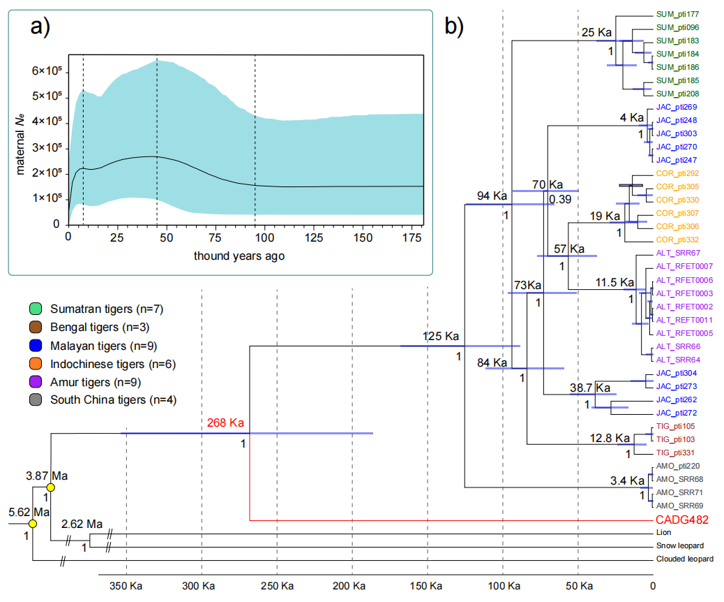 a) 老虎母系有效种群动态变化; b) 老虎线粒体系统发育关系