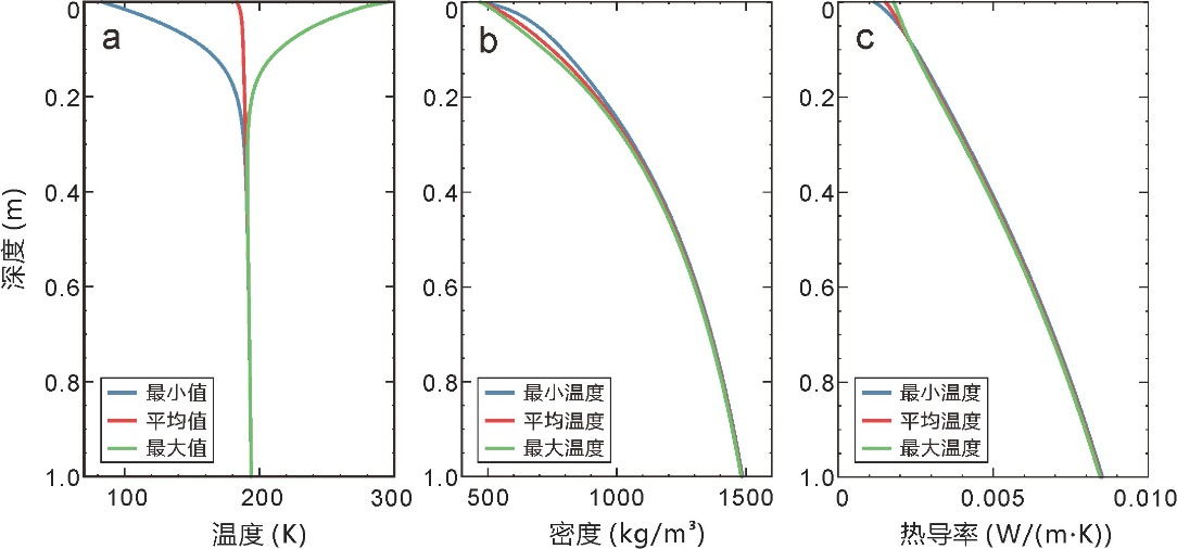 嫦娥四号着陆点月壤粒径为15μm的温度、密度和热导率剖面图。(a)从月表到1米深度的最小、平均和最大温度的剖面图。(b和c)从月表到1米深度的密度剖面图和热导率中的热传导分量剖面图,对应图3a的最小、平均和最大温度。