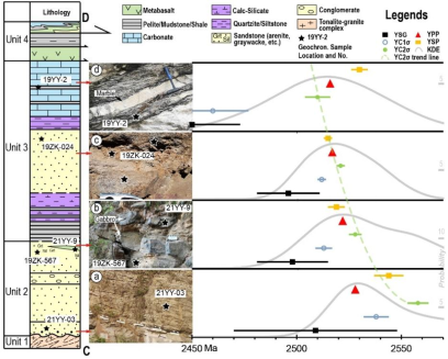 图2.沉积层序的建立(左)及碎屑锆石类最大沉积岩年龄的约束结果(右)。多种计算方法中,YC2σ(绿色圆形)是最优计算结果,用于最终的年龄约束(2560-2510Ma)
