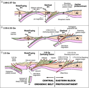 造山带及周缘沉积层序有助于建立造山过程和地表变化之间的联系。该团队长期在华北克拉通中部造山带东缘开展大地构造研究,并在赞皇地体报道晚太古代板块横向汇聚边界典型判别标志-华北最古老的构造混杂岩带和大规模板块水平运动形成的巨型逆冲推覆体(图1)。赞皇地体古板块汇聚边界东缘沉积层序长期以来被认为是东部陆块之上的被动大陆边缘沉积(图1),而晚太古宙中部造山带的洋弧通过汇聚增生在东部陆块之上。