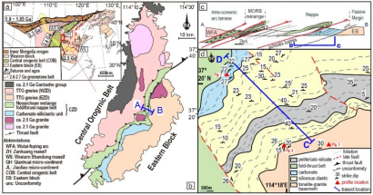 图1.沉积岩层序所在地区地质图。(a)研究区位于华北克拉通中部造山带和东部陆块交界处。(b)赞皇地区地质图。(c)赞皇地区弧陆碰撞造山带构造剖面图,研究的地层层序所在的位置(C-D)。(d)沉积层序出露区地质填图。