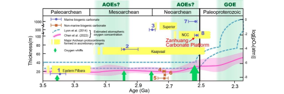 图4.全球太古宙数据统计图指示“增生岛弧背缘沉降型大陆被动边缘(紫色圆)”在其所属的大陆/克拉通形成和稳定前期(黄色)大量发育沉积,并同时引起氧气波动。GOE:全球大气氧化事件,AOE:太古宙大气氧化事件.