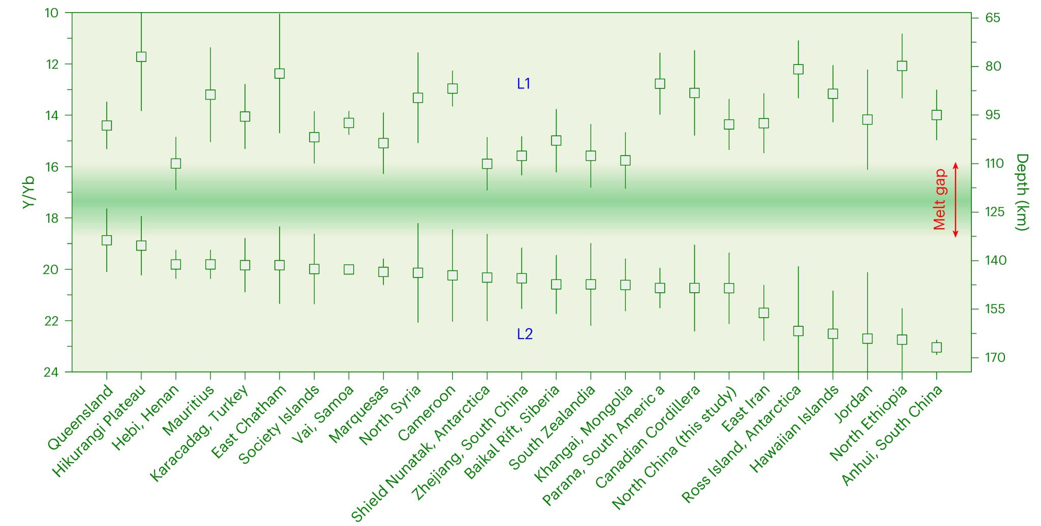 图3 不同构造板块25个地区的大洋/大陆玄武岩具有类似的双峰式Y/Yb比值. 软流圈熔体分层结构 (80–110 km vs. 140–165 km) 在全球范围内广泛分布.