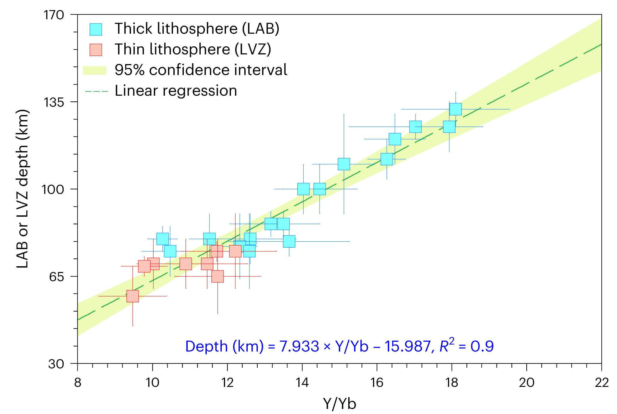 该研究团队通过收集整理全球年轻火山岩地区已有的地球物理—地球化学资料,发现大陆/大洋玄武岩Y/Yb比值和相关地区的岩石圈—软流圈边界(LAB)或地震低速异常带(LVZ)深度数据之间具有明显的正相关性,由此建立了基于玄武岩Y/Yb比值估算地幔熔融深度的简单压力计[深度(km) = 7.933 ´ Y/Yb – 15.987; 图1]。