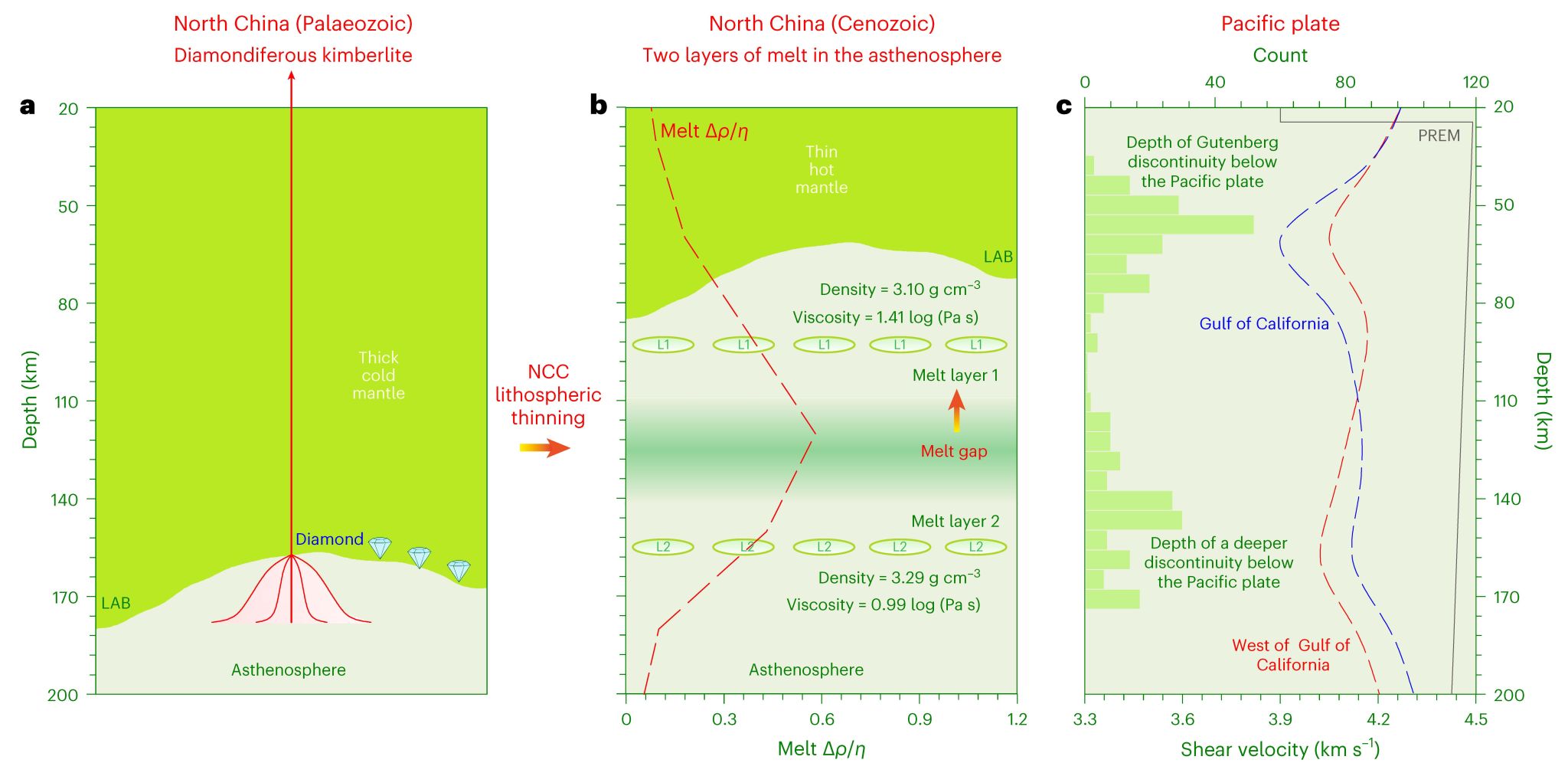 通过对全球玄武岩地球化学数据的统计分析发现,不同构造板块喷发的大洋/大陆玄武岩Y/Yb比值具有双峰式分布特征,对应了两种不同来源深度的软流圈熔体(80–110 km vs. 140–165 km),这也大致对应于地球物理观察到的双剪切波低速带深度 (图2和图3)。此外,该研究团队还发现不同起源深度的软流圈熔体也对应了截然不同的熔体物理—化学性质,浅源熔体(80–110 km)为富硅熔体(密度低),深源熔体(140–165 km)为贫硅富铁熔体(密度高、粘度低以及熔体活动性低),而铁对深源熔体在软流圈140–165 km深度的稳定性可能扮演了极其关键的角色。高温高压实验结果也显示,熔体活动性(Δρ/η—衡量熔体稳定与迁移能力的重要参数)在110–140km压力范围内最强(相应深度熔体向上迁移),导致软流圈110–140 km深度处几乎没有熔体出现,这一过程可能是软流圈熔体分层结构形成的重要机制(图2)。