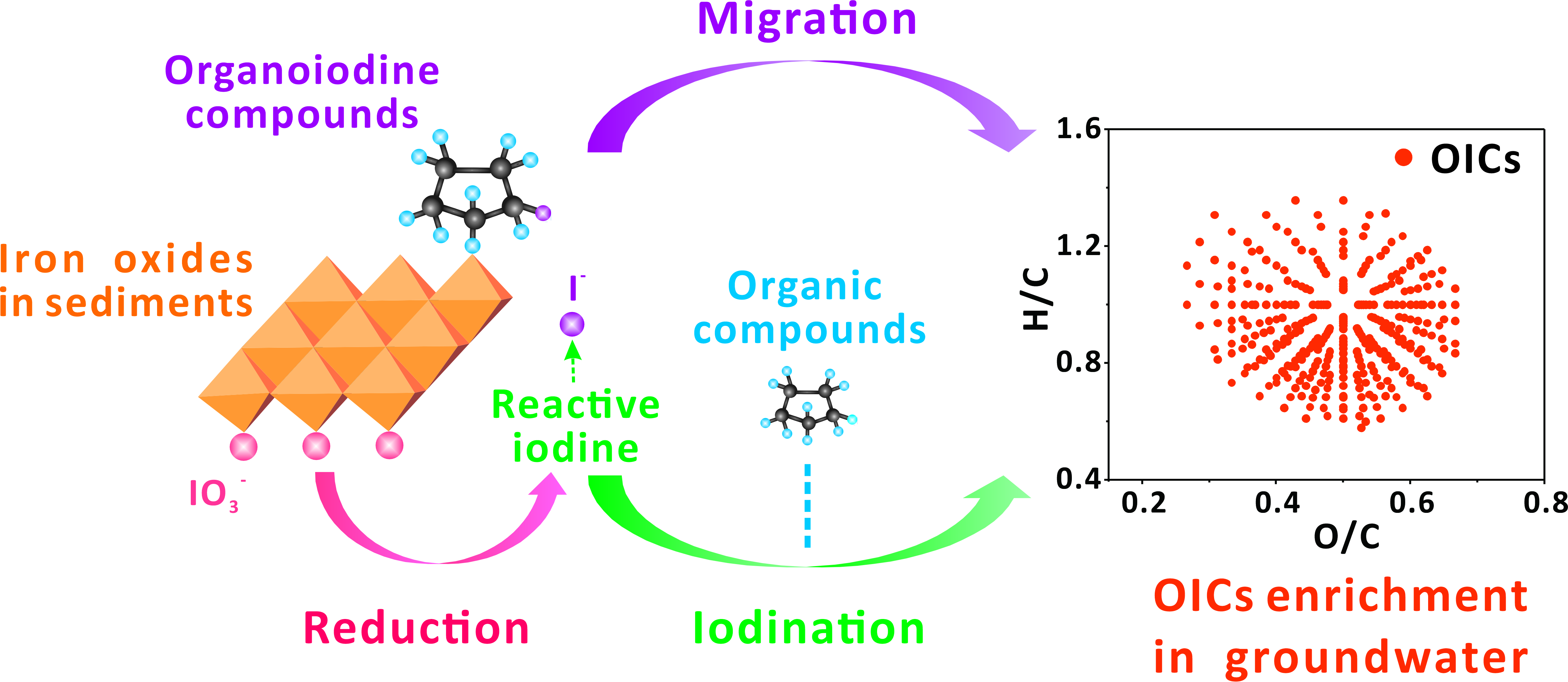 长期摄入高碘地下水(碘浓度>100µg/L)会造成人体甲状腺机能损伤。水源性高碘甲肿已成为全球普遍存在的环境健康问题。地下水系统中的碘通常以无机碘(碘离子和碘酸盐)和有机碘的形态存在。有机碘化合物是无机碘与天然有机质结合的产物,具有强细胞毒性和基因毒性,其形成机制与控制方法在消毒副产物研究中备受关注。然而天然地下水环境中有机碘化合物的来源与形成机制尚不清楚,与铁矿物结合有机质介导的碘形态转化研究十分有限,天然地下水中有机碘化合物的环境健康风险仍存在诸多不确定性。