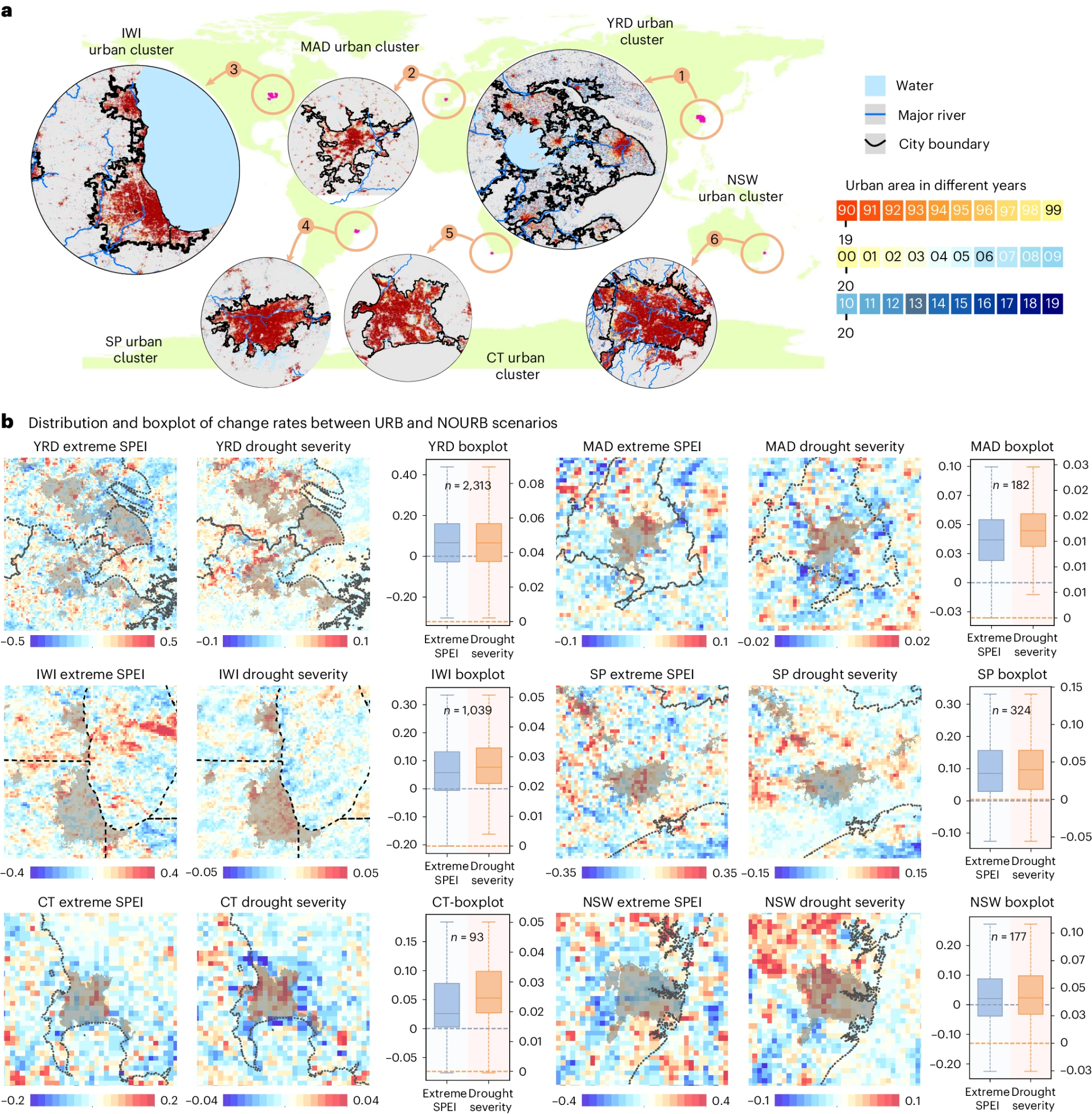 地大新闻网讯 (通讯员 王思琪)近日,由我校国家地理信息系统工程技术研究中心陈能成教授带领的智慧地球团队与国内外合作者,在《自然》(Nature)子刊《自然·城市》(Nature Cities)发表题为《全球范围城市化导致的极端干旱加剧》的学术论文,定量揭示了全球城市化对局地极端干旱加剧的影响。论文第一作者为该团队2022级博士生黄舒哲,通讯作者为陈能成教授与武汉大学测绘遥感信息工程国家重点实验室王超副教授。同期,《自然》杂志特邀作者在Nature Research Briefing专栏以题为《城市化加剧了全球几乎一半城市的极端干旱》,在线报道了该研究成果。