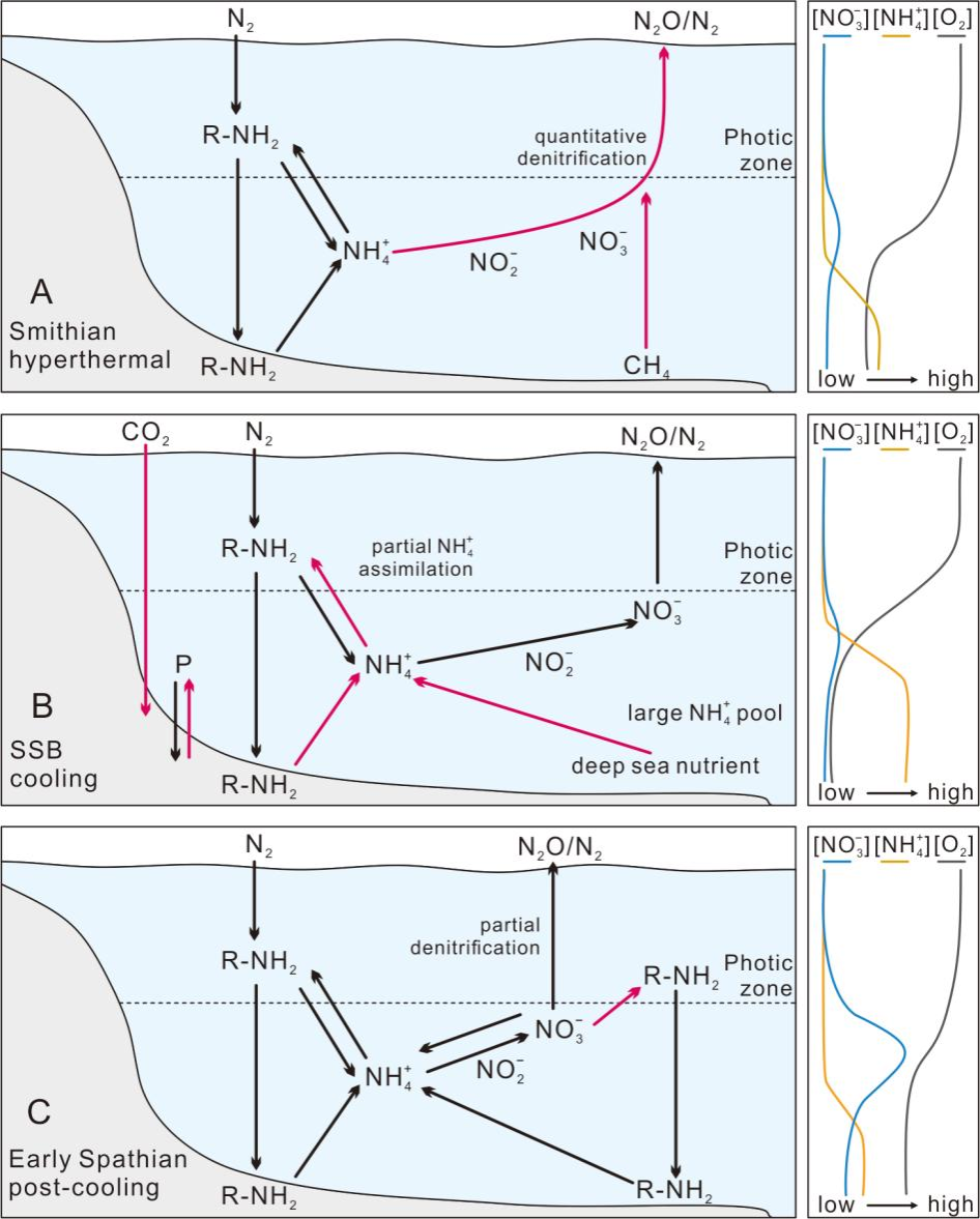 研究发现,Smithian亚期的氮同位素值明显偏低,指示极端高温造成了不同盆地和沉积相普遍存在营养氮元素的匮乏,微生物固氮作用主导了该时期的海洋氮循环,释放的温室气体N2O进一步加剧了全球变暖。Smithian-Spathian之交降温过程的不稳定性使得氮循环在空间上呈现显著的差异;降温后的Spathian早期,低纬度地区迅速构建起硝酸盐库和含氧氮循环,氮同位素值升高。该研究揭示了极端气候转变期氮循环与温度在地质尺度上的紧密联系,不仅表明营养氮供给对温度变化存在密切响应,还为地质微生物控制的氮循环过程在环境和生物演化复苏中可能起到的关键作用提供了依据。