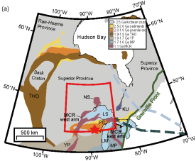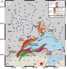 形成于约11亿年前的北美中陆大裂谷系统(Midcontinent Rift, MCR)是存在于太古宙劳伦大陆苏必利尔省内发育失败的大陆裂谷,是北美大陆中部重要的前寒武地质特征之一。裂谷时期出露于苏必利尔湖附近的大量的火成岩,被认为是先存结构的再活化、基维诺地幔柱的上涌和减压熔融、或异常热/富集地幔的上涌共同作用的结果。东、西两支相交的裂谷分支横跨太古宙和古元古代单元;西侧分支向西南延伸约2000公里,东侧分支被格林维尔造山带截断。MCR与地幔柱上方大陆裂谷的经典三分支相交模型(three-arm model)形成鲜明对比,即向北的第三裂谷分支或拗拉槽的缺失,以及东西两相交的裂谷分支偏离推断的地幔柱中心约300公里等问题,尚未得到很好的理解。