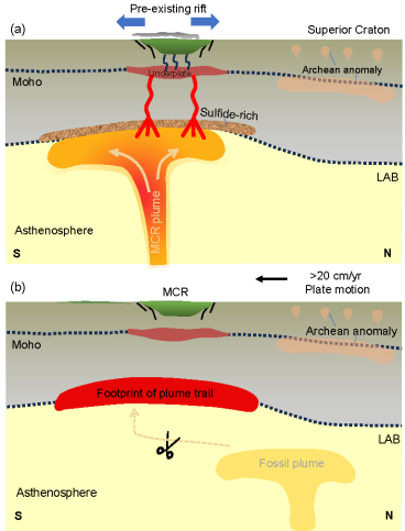 图3苏必利尔湖周围地下岩石圈底部导电异常形成的可能模式。绿色为火山岩。(a)苏必利尔省的一段岩石圈富含硫化物,基威诺地幔柱对苏必利尔湖周围岩石圈的撞击为矿物颗粒间硫化物的相互连接提供了潜在的机制,从而产生了观测到的高导电性特征。在地幔柱充击过程中,先前存在的裂谷区域被重新激活,从而在苏必利尔湖周围形成了洪积玄武岩岩浆活动、地壳底侵、基性-超基性侵入体以及富硫化物矿床。苏必利尔省内的零散MT异常很可能是由于太古宙热液流和岩浆喷发造成的。(b)在MCR形成期间,劳伦大陆以大于20厘米/年的速度向南(按现在的方向)快速运动,切断了与地幔柱的联系,留下了区域性的 NW-SE 走向的高导迹线。