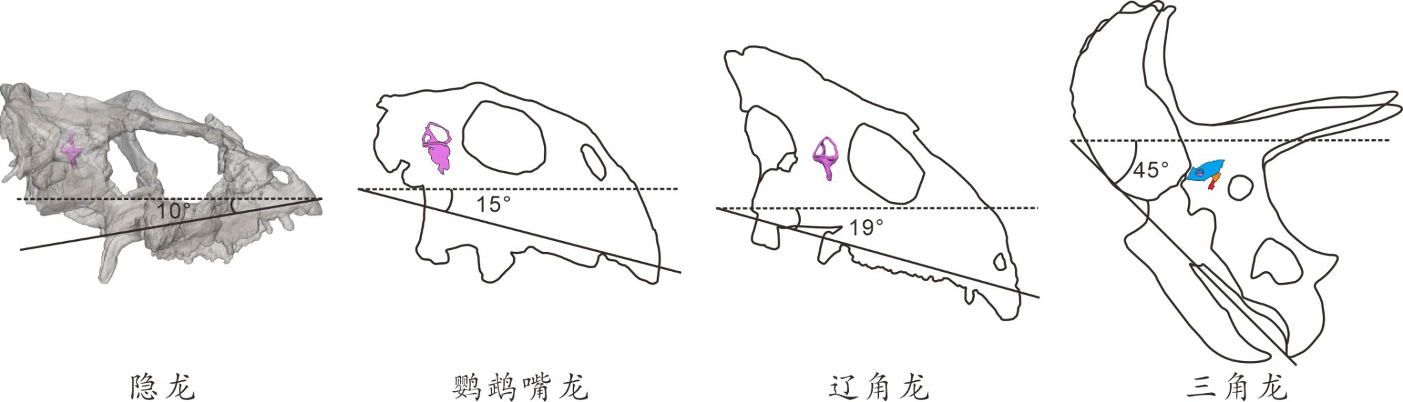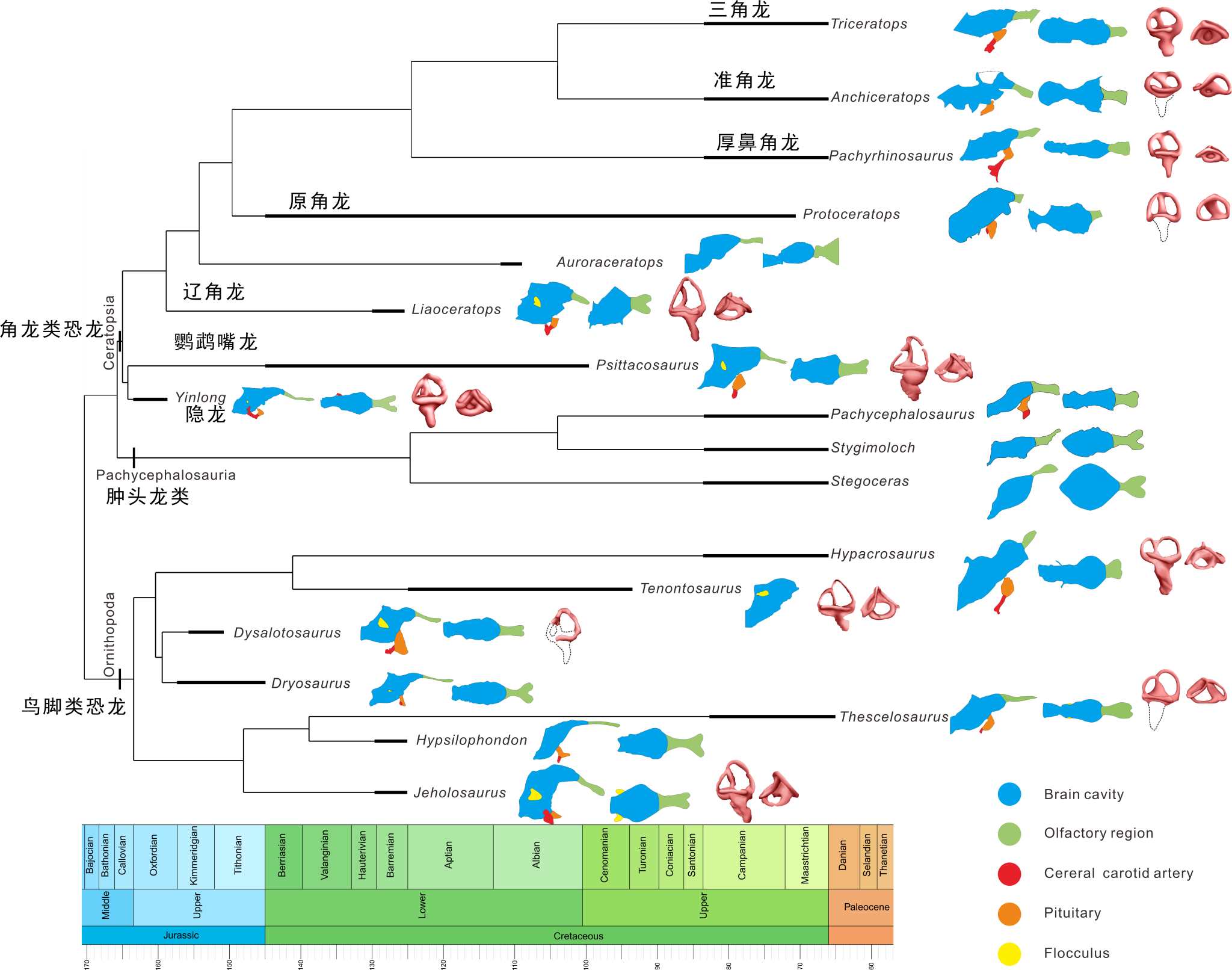图2:角龙类恐龙脑颅和内耳的演化图