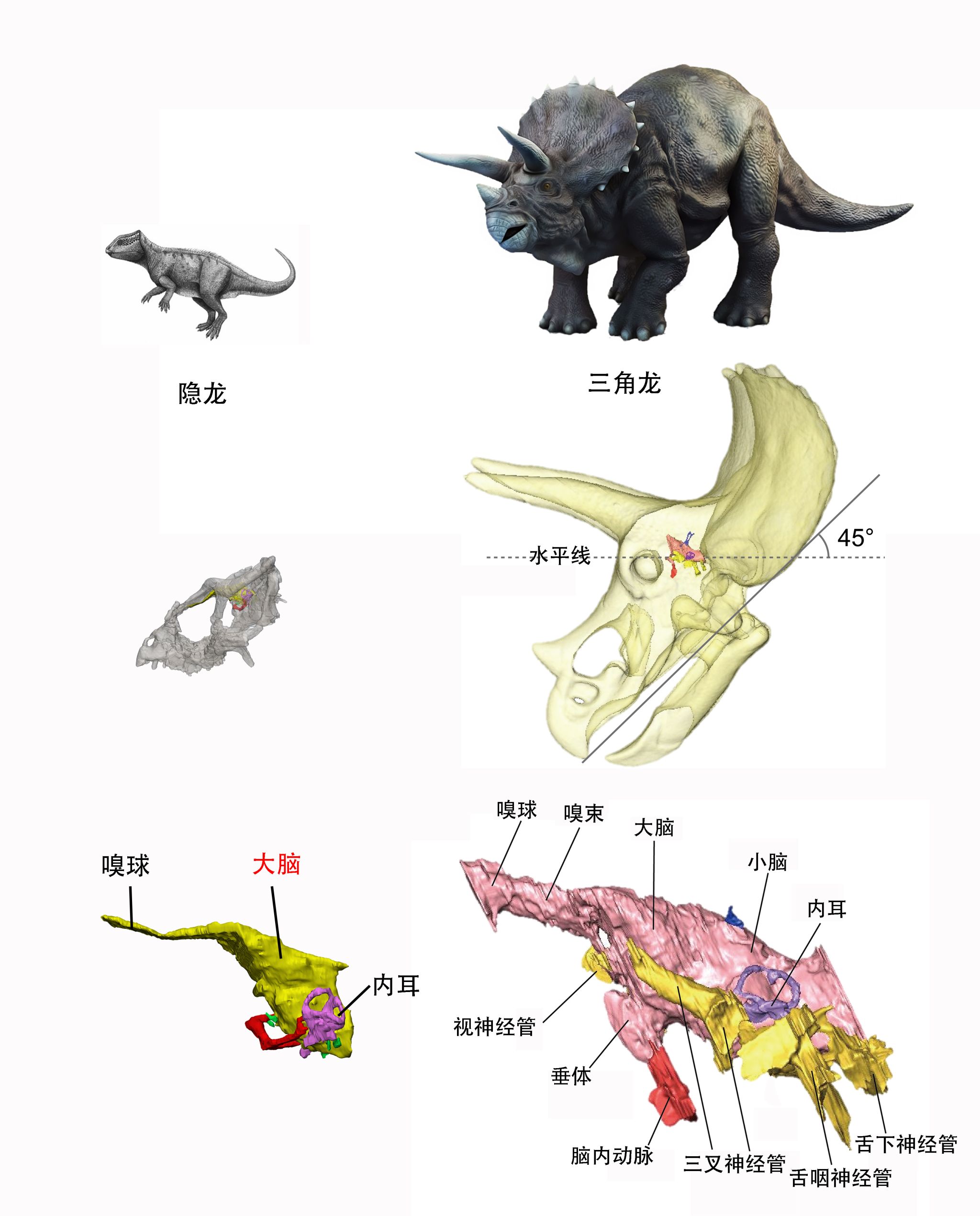 早在1996年,本研究的合作者之一Catherine Forster就对三角龙的脑腔开展研究。近几年,研究者们重建了三角龙的颅腔三维模型(图1)。这些研究发现三角龙的大脑相对头骨比较小,头部运动缓慢,头部习惯于向下倾斜,这有助于它们展示头部的角和颈盾,更适应听一些低频率的声音。因此研究人员推断三角龙并不是很聪明。