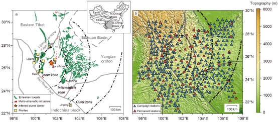 峨眉山大火成岩省是我国境内第一个获得国际学术界广泛认可的大火成岩省,也是全球范围内研究起步较早、研究程度最高的大陆溢流玄武岩省之一。ChinArray宽频带密集台阵已对该区关键部位形成良好覆盖,为开展古地幔柱作用精细探测研究提供了良好契机(如图1所示)。