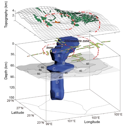 (1)发现峨眉山大火成岩省下方,存在一个孤立的、贯穿岩石圈的高速异常体(S波异常幅值>4 %,图2),该异常体自浅表延伸至~135 km,并在不同深度层次,显示出不同的几何分布与异常幅值(图2中,A,B,C,D,E各段所示),特别是在浅部地壳(深度<20 km)还存在一定程度偏离(图2中A段所示),但在立体形态上仍总体呈现一个完整的、近垂直圆柱体,主体直径>100 km。结合前期二维综合地球物理剖面在地壳结构/组分特征等方面的系统约束,特别是该柱体恰位于峨眉山大火成岩省的内带,且所在位置方位各向异性极弱(SKS波分裂时差<0.35 s,甚至检测不到分裂)、有苦橄岩零星出露等特征,推断该贯穿岩石圈的柱形高速体为峨眉山大火成岩省的深部根源,即二叠纪峨眉山地幔柱作用固化于大火成岩省岩石圈中的巨型岩浆系统;