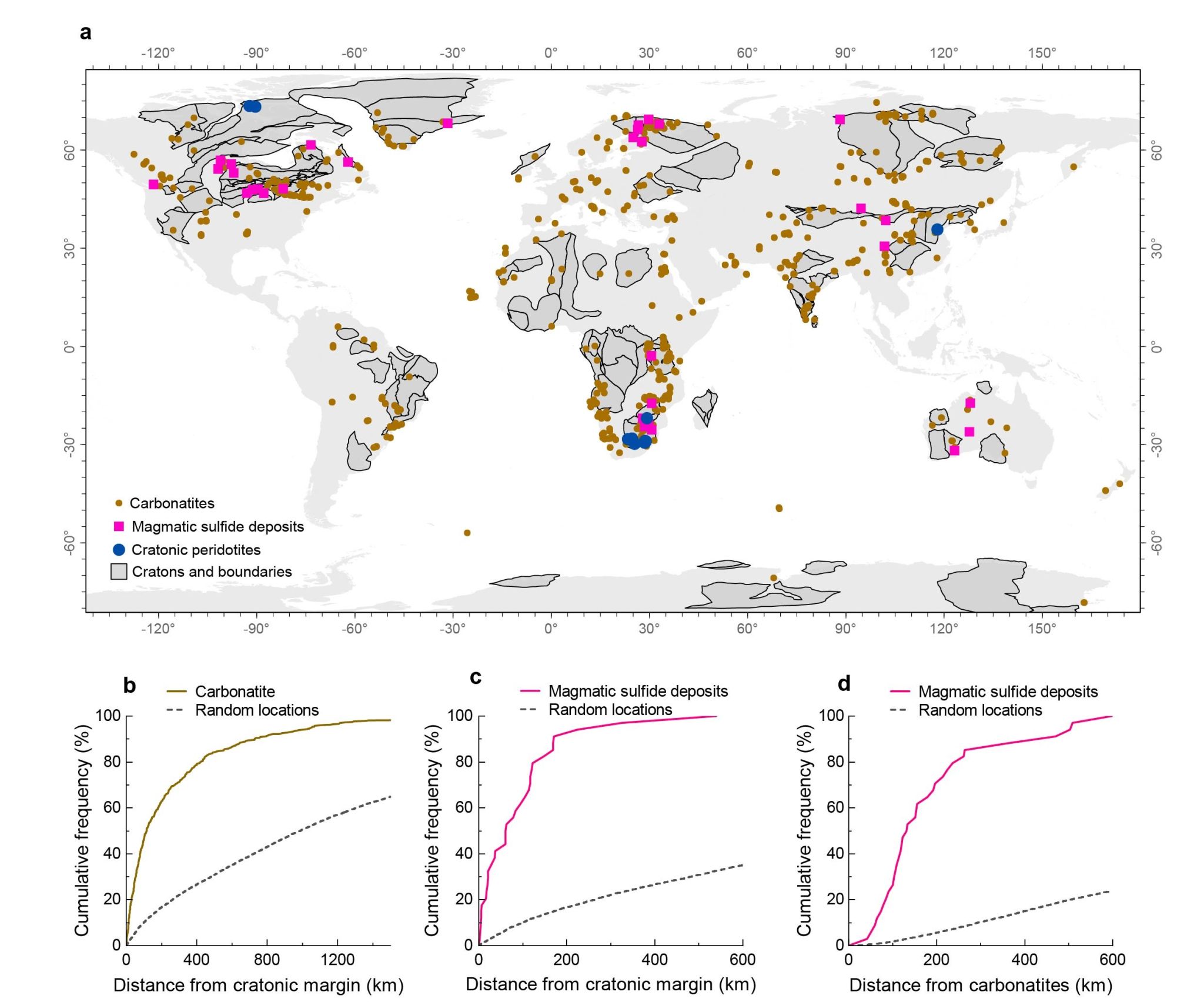 该论文通过对碳酸岩、硫化物矿床和克拉通的时空相关性分析,发现克拉通边缘区域同时富集火成碳酸岩和岩浆硫化物矿床,硫化物矿床与碳酸岩通常具有时空一致性,表明由碳酸盐熔体迁移形成的富硫化物大陆根控制了岩浆硫化物矿床的分布。该研究揭示了硫化物矿床与碳酸岩之间的成因关系,发现了克拉通边缘的富碳酸岩区域是关键金属的富集地,这一发现为未来矿产资源的勘探和开发提供了科学依据和重要方向。