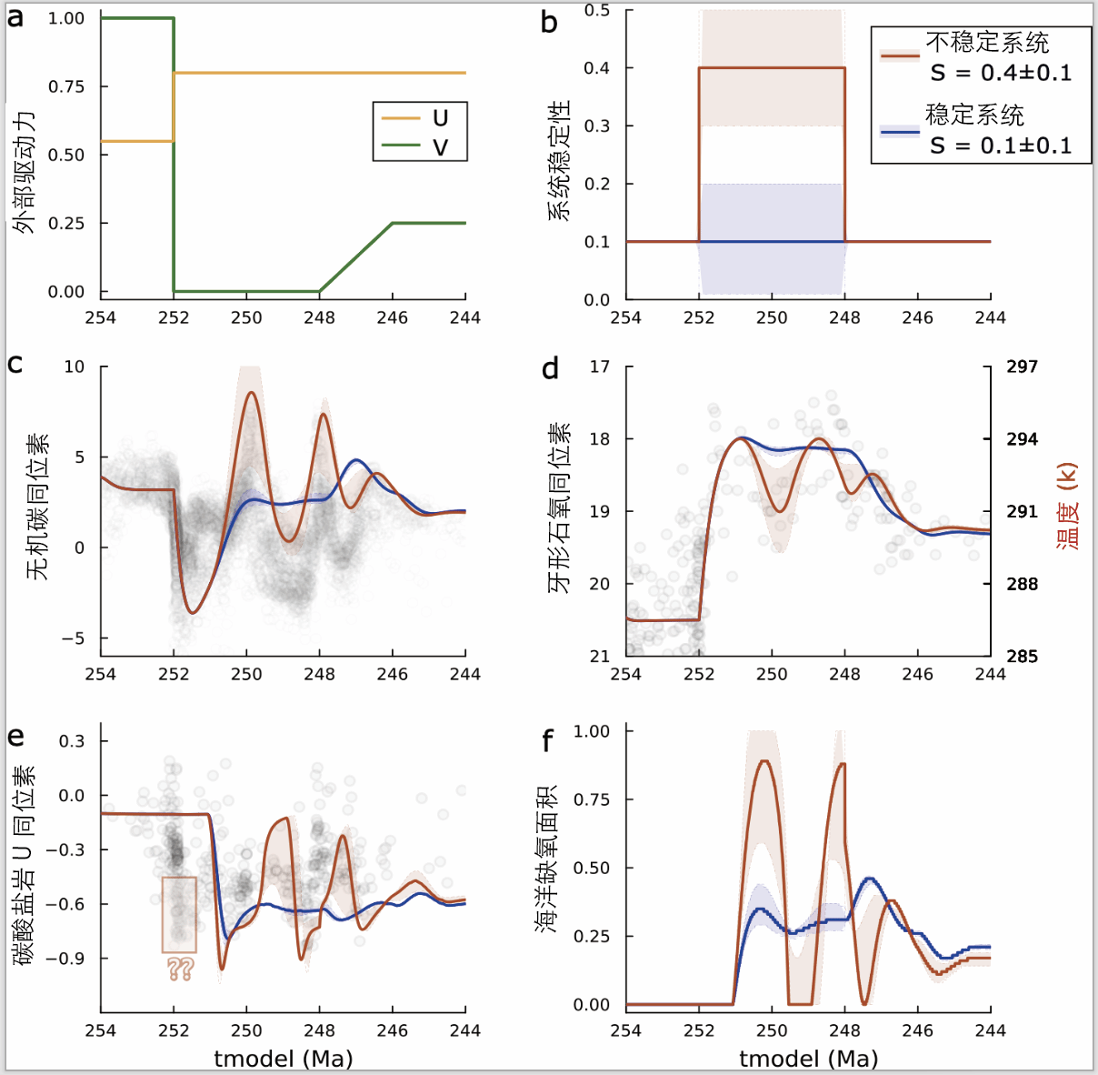 这项研究在传统生物地球化学模型的基础上加入了非线性分析模块,开发出新的“自持振荡”(self-sustaining oscillation)模型,模拟二叠纪末大灭绝及其后持续约600万年的温室、碳循环和海洋氧化还原环境波动的内在联系和驱动机制。结果表明发生在早三叠世温室时期一系列生物地球化学剧烈波动,是大灭绝时地球系统遭受严重破坏后出现的内部连锁反应,是表生地球系统的“不稳定系统性行为”,不受更多外部驱动力的叠加或反复出现。