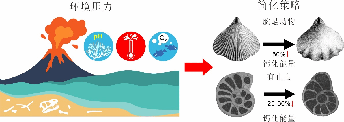 火山喷发引发海洋酸化、缺氧与升温,三者共同作用导致腕足动物和有孔虫的形态简化。通过减少壳饰或减薄壳体,这些钙化生物得以应对环境压力下日益增加的钙化能耗。