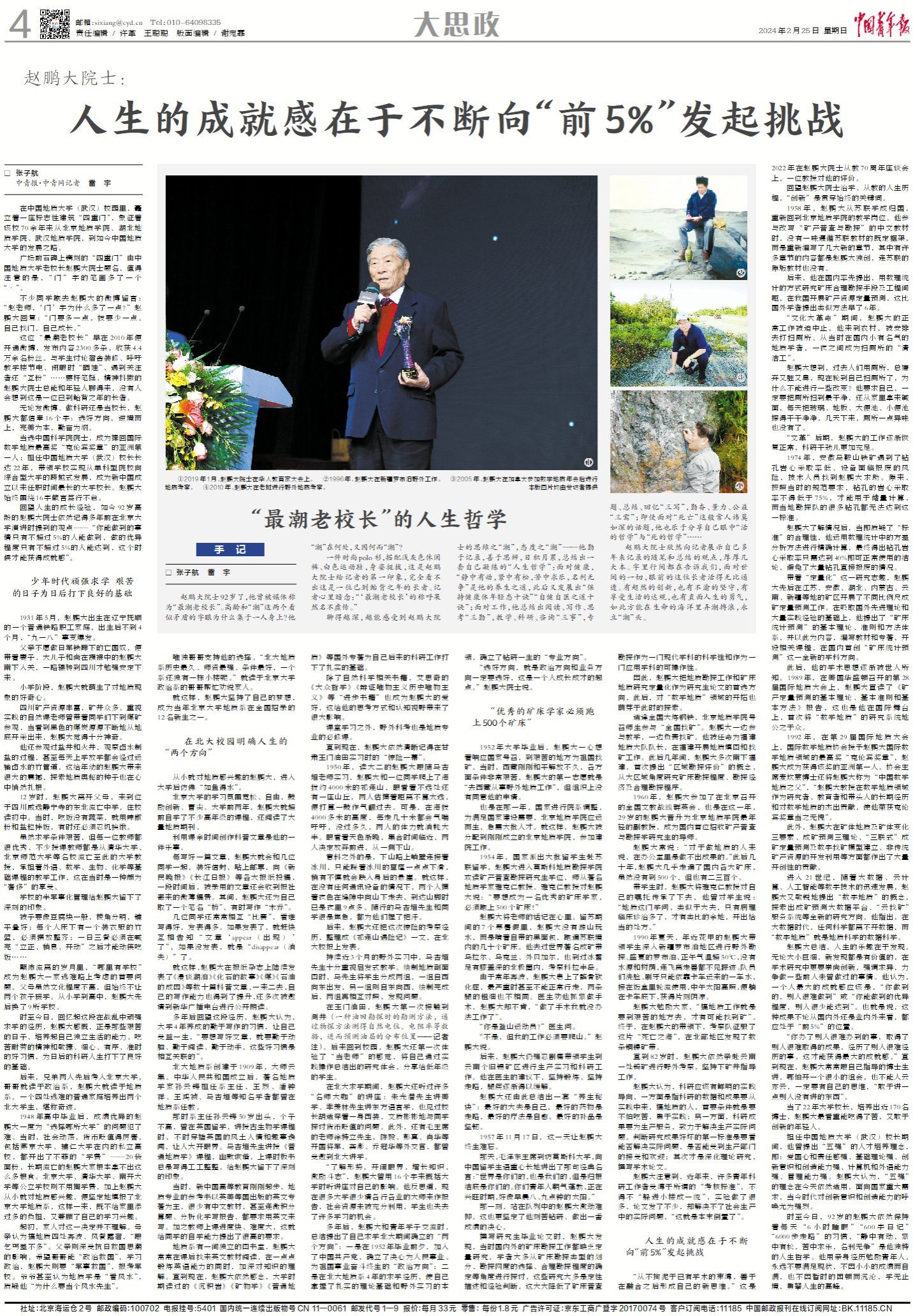 编者按:2月25日,《中国青年报》以《赵鹏大院士:人生的成就感在于不断向“前5%”发起挑战》为题,整版报道我校赵鹏大院士的奋斗故事,勉励青年人学无止境,勇攀人生的高峰,原文如下: