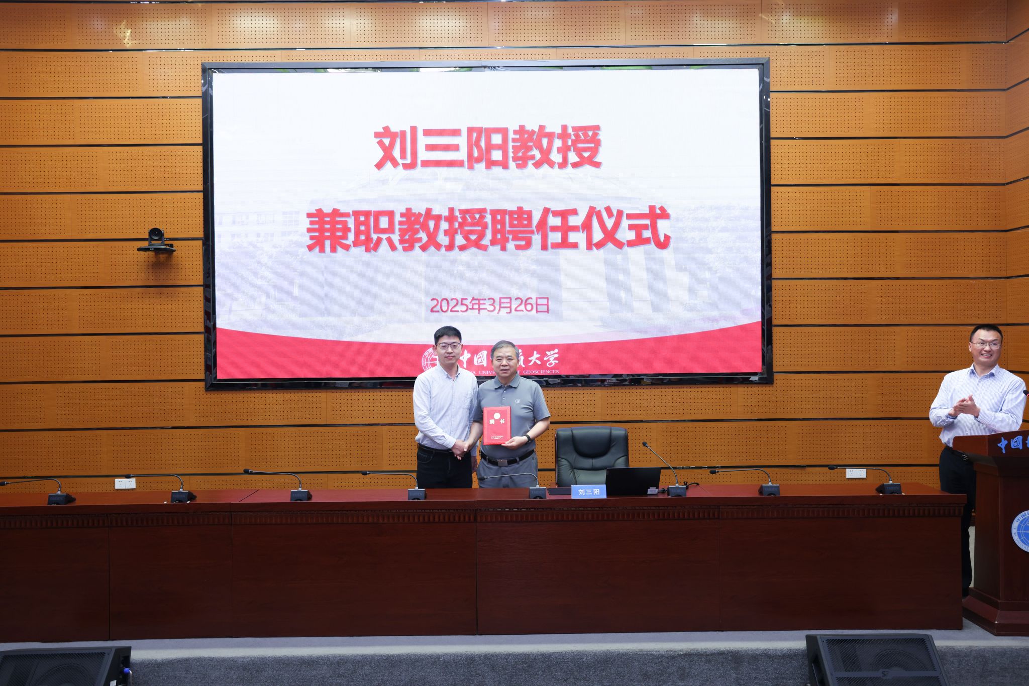 数学与物理学院院长魏周超向刘三阳颁发兼职教授聘书。