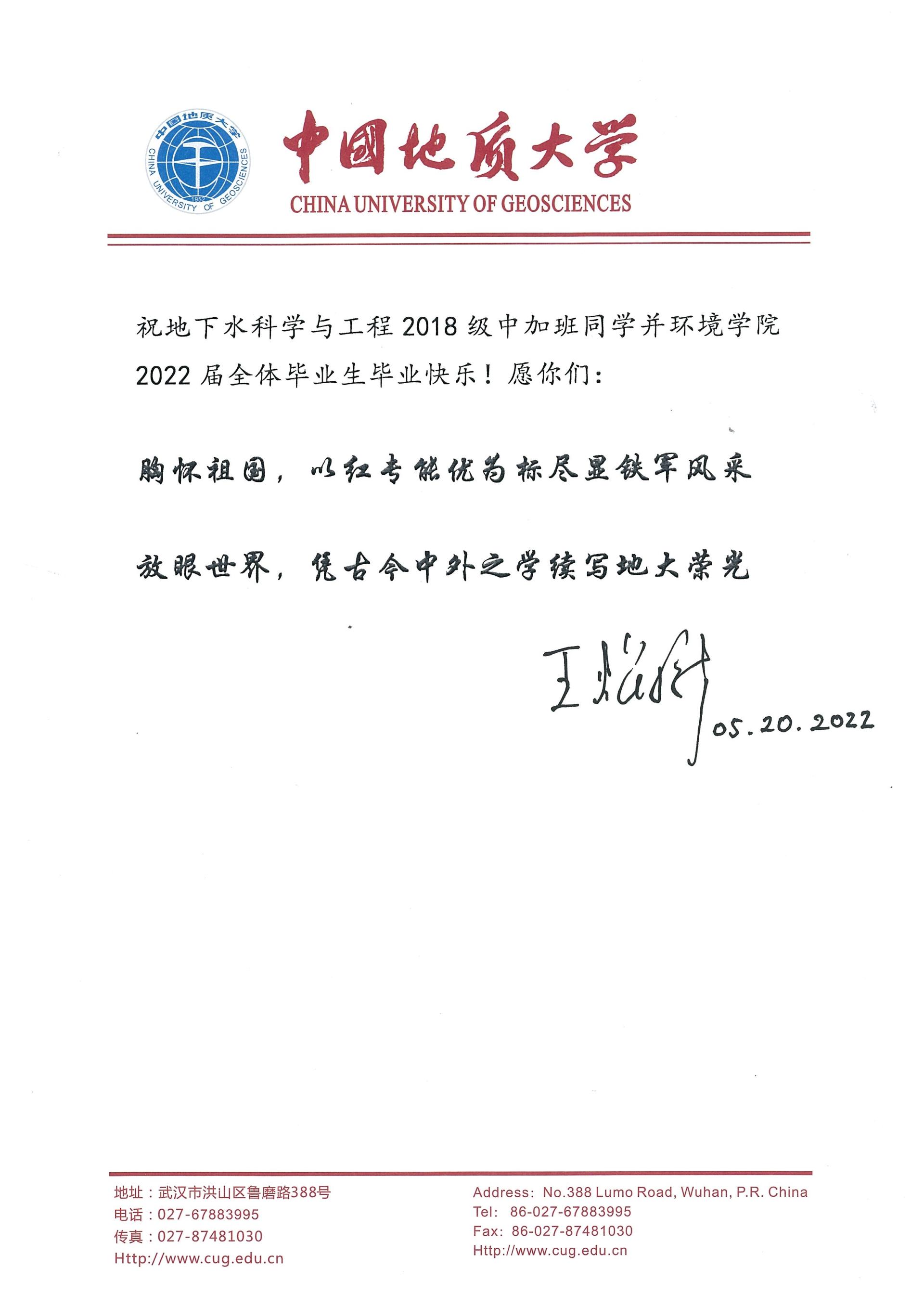 “胸怀祖国,以红专能优为标尽显铁军风采;放眼世界,凭古今中外之学续写地大荣光”。2022年5月20日,地下水科学与工程2018级中加班的同学们收到了来自校长王焰新院士的真情“表白”,在首届中加班开学典礼上,王焰新也曾寄语同学们,“要树立信心、勤奋学习、拓展国际视野、争做中外交流使者”,中加学子以实际行动践行着环境学院红专能优生态环保铁军的风采。