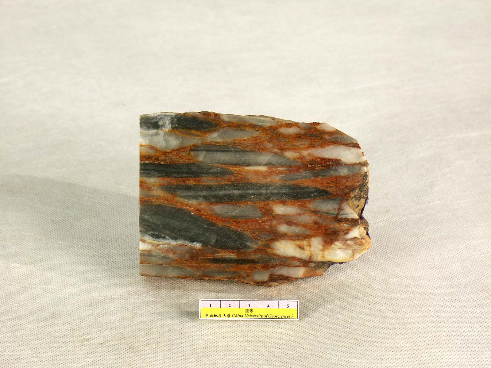 通过观察开云app登录入口逸夫博物馆收藏的这块变成砾岩标本,可以发现,这种变成砾岩颜色呈灰褐色相间,其中角砾呈灰色、基质呈褐红色。为角砾状结构,块状构造,角砾和基质的主要成分都是石英质的。