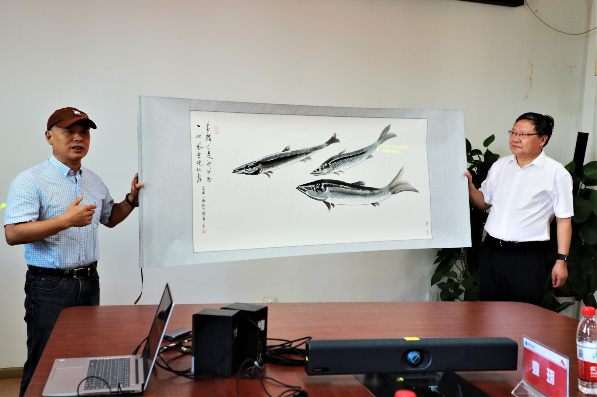 储祖旺代表学校接受捐赠,副校长赖旭龙为其颁发捐赠证书。欧阳德彪此次捐赠的画作为中国画《鱼儿》,画作寓意学生通过努力学习,成为更优秀的自己,表达了对莘莘学子的殷切期望。