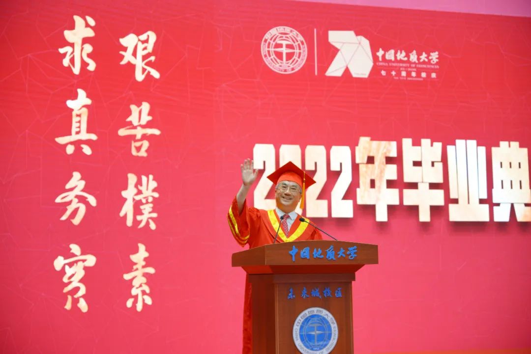 希望同学们秉承历史荣光,赢得更大光荣。如果说全球的大学组成一条星河,在我心中,地大就是其中最亮、最美的那颗星。70岁的地大历经沧桑,却仍旧青春鼎盛、熠熠生辉。在祖国最需要的时候,老一辈革命家、红色科学家挺身而出,弘“动地”之志,传“工学”之道,展“新型社会主义理工科大学”之愿,建起了新中国最早的高等地质教育体系,为百业待举的新中国建设做出重大贡献。在栉风沐雨、艰苦创业、开疆扩土中,地大人践行着“胸怀大局、初心如磐、艰苦创业、勇攀高峰”的“南迁精神”;在攀登自然高峰、科学高峰、人生高峰中,地大人彰显了“扎根中国、胸怀天下、勇攀高峰、追求卓越”的攀登精神,汇聚成爱国、报国、强国的强大精神力量。这些精神“富矿”,使得学校始终站在大学精神之高位,成为我们最宝贵的育人资源。前不久,我国著名的地球化学动力学家、矿床地球化学家、地质教育家於崇文先生永远的离开了我们,但他一生践行的“学习思考、锲而不舍、探索创新、攀登不息”16字学习工作总结,不但解开了地大人书写七秩荣光的精神密码,而且留给我们一笔弥足珍贵的精神财富。当前,我们正处在建设地球科学领域国际知名研究型大学关键阶段。站在70年办学的新起点,我们比任何时候都需要这些精神“食粮”补精神之钙,比任何时候都需要秉承历史荣光闯发展新路。我们要一代接着一代干、一代要比一代拼、一代更比一代强。希望同学们做“不断线的风筝”,飞跃山河湖海,始终牢记自己“地大人”的身份。做“不消散的电波”,保持永远蓄电、永不断电的状态;做“不褪色的 CUGer”,始终不改“艰苦朴素,求真务实”的本色,不断擦亮地大人的精神底色,不断增添大学精神的新亮色,为母校、为国家努力赢得新的更大的光荣。