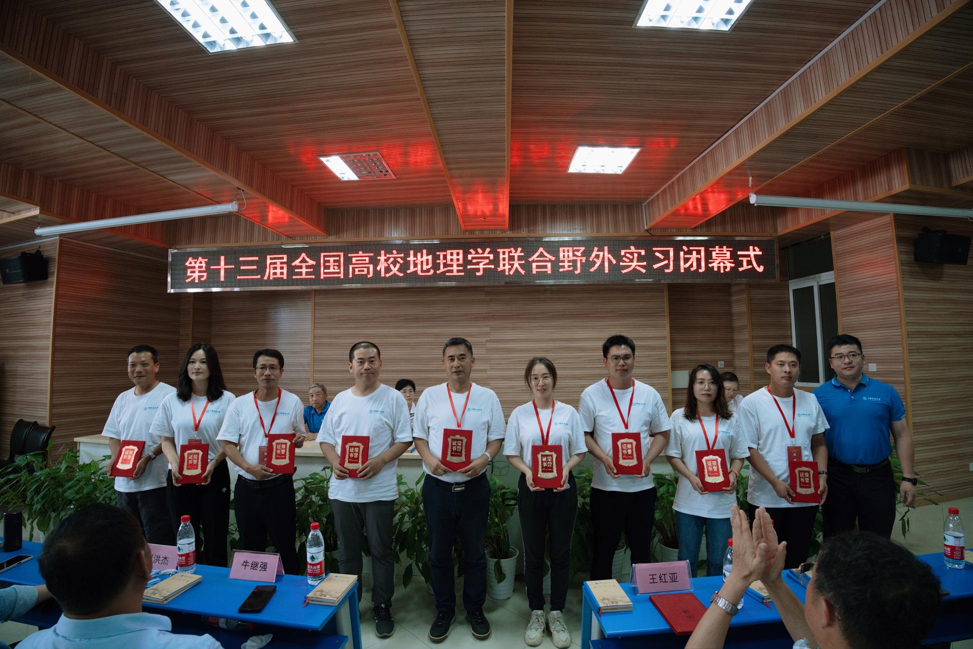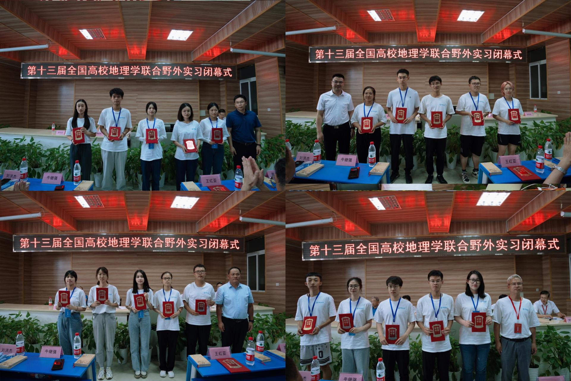 我校地理与信息工程学院党委书记许德华宣读《关于表彰2022年第十三届全国高校地理学联合野外实习优秀实习指导老师、优秀实习学生的决定》。党委研究生工作部部长王甫、党委学生工作部部长邬海峰、信阳师范学院地理科学学院院长牛继强、许德华为优秀学生代表颁发荣誉证书。