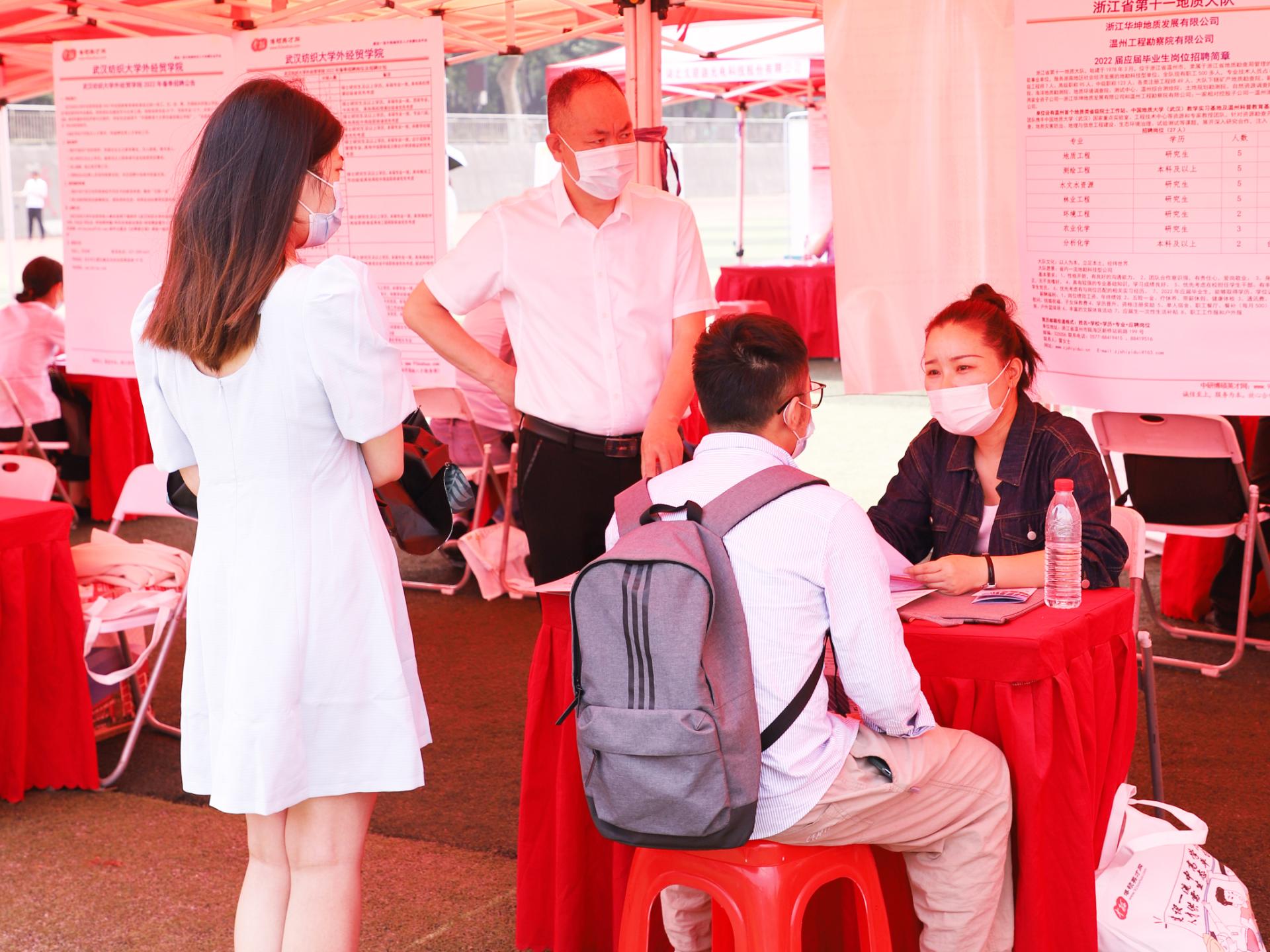 招聘会现场,还设置会务服务、简历门诊、签约咨询等就业服务区,为广大毕业生和用人单位提供就业咨询、手续办理、洽谈交流等服务。经管、外语、地学、材化等学院学生工作负责人和毕业班辅导员,根据招聘会备会制度,在招聘会现场主动对接用人单位,深入交流供需信息,充分利用招聘会资源,提高供需对接效率。