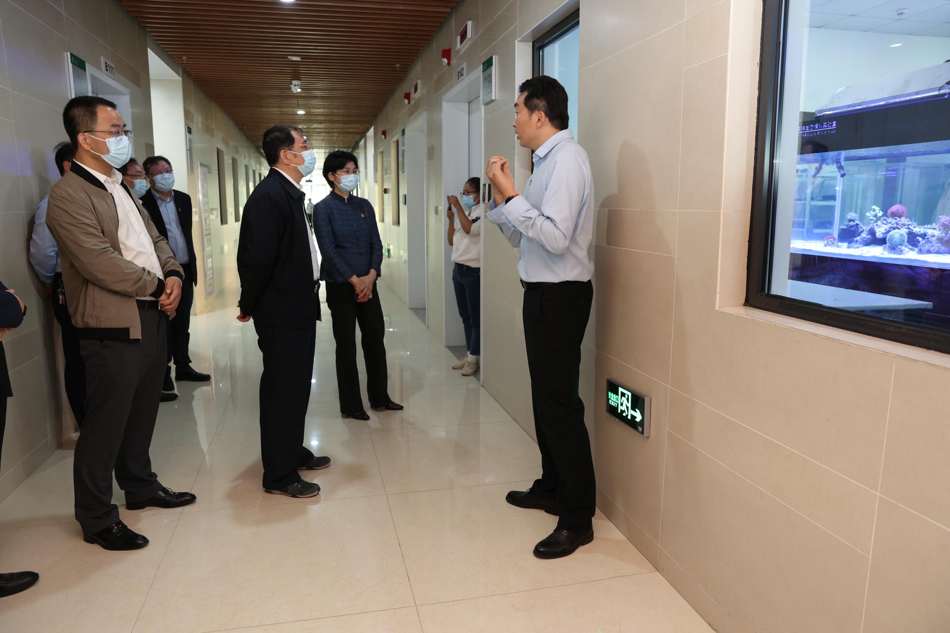 张幸平一行参观了生物地质与环境地质国家重点实验室,宋虎跃教授介绍了生环国重党支部建设情况。生环国重副主任宋海军教授对海洋动物、陆地植物等模拟实验室进行了介绍。