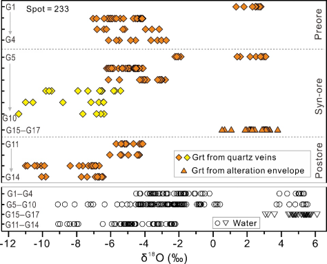 各成矿阶段的石榴石及与之平衡的成矿流体的氧同位素组成