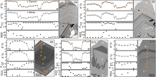 为回答上述科学问题,李建威教授团队以我国华北克拉通东坪超大型脉状金矿床为研究对象,对不同成矿阶段形成的石榴石进行了详细的矿物显微结构、矿物化学和氧同位素分析。他们利用二次离子探针技术,对各类石榴石进行了系统的高精度微区原位氧同位素分析,并通过石榴石—水的氧同位素分馏方程计算出成矿前期、主成矿期和成矿后期的流体氧同位素组成。研究结果表明,同一成矿阶段的不同石榴石颗粒以及同一石榴石颗粒的不同生长环带其氧同位素组成,均表现出频繁的动荡变化;这种频繁和剧烈的同位素变异无法用石榴石结晶温度变化、石榴石的化学成分变化、成矿流体沸腾等因素所引起的同位素分馏来解释。他们进一步通过水—岩相互作用过程的数值模拟,排除了成矿流体与容矿岩石之间的氧同位素交换是导致上述同位素变化的原因。