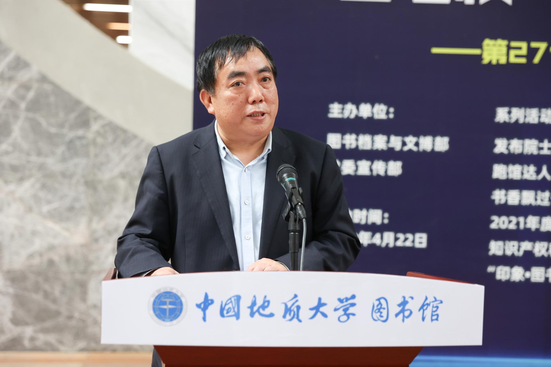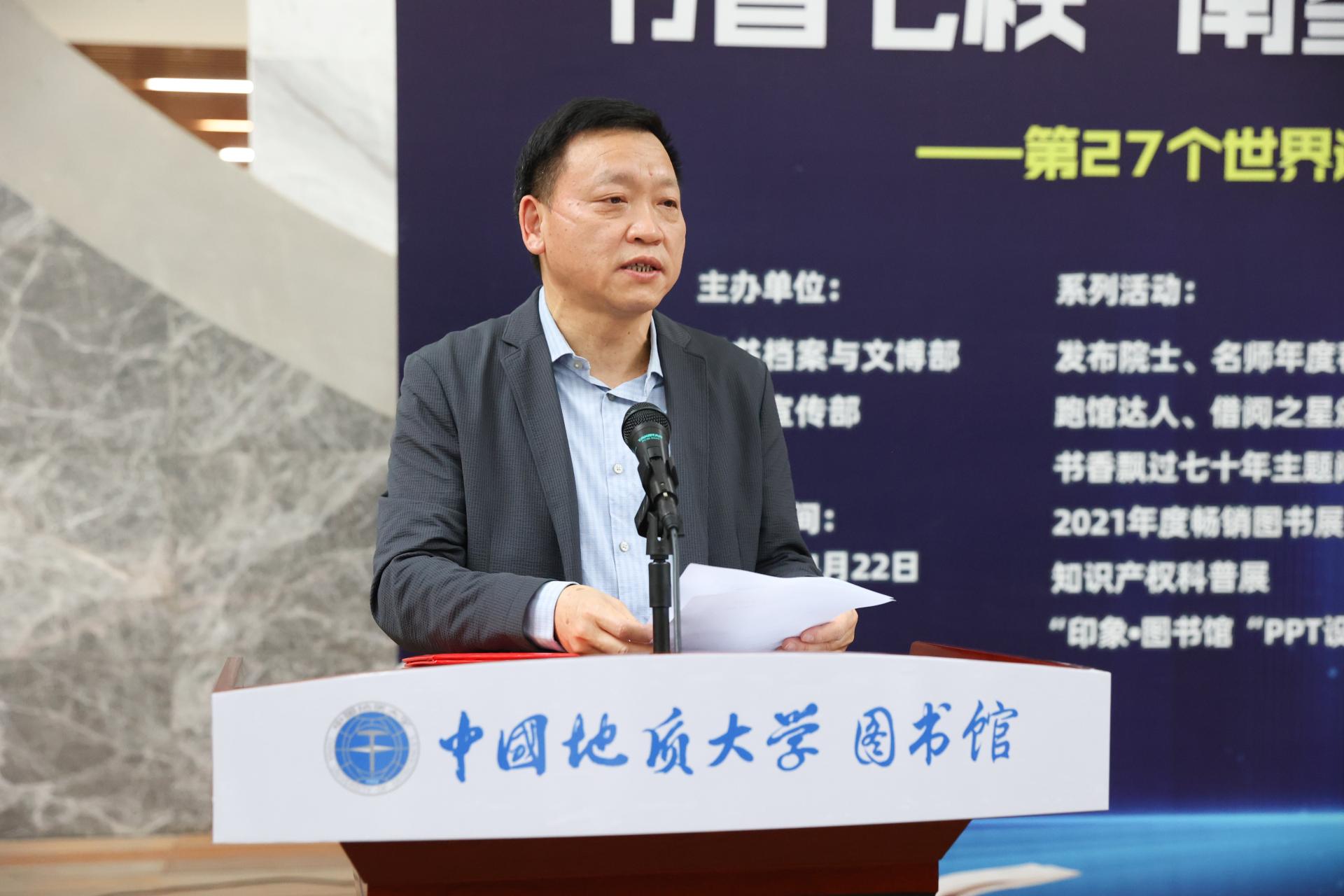 赖旭龙致辞。他指出,在世界读书日举办书香文化节,是地大坚持了六年的校园文化活动,是地大知识传播的品牌,也是学校建设书香校园的重要举措。在全球携手抗疫的背景下,营造浓厚的读书氛围,倡导全民阅读,就是要让师生在书香中感悟生命美好,汲取奋进力量。他号召全体师生一起翻开书籍,享受阅读,让智慧的阳光照亮人生,让阅读在地大蔚然成风,共建书香校园,共享文明校园。