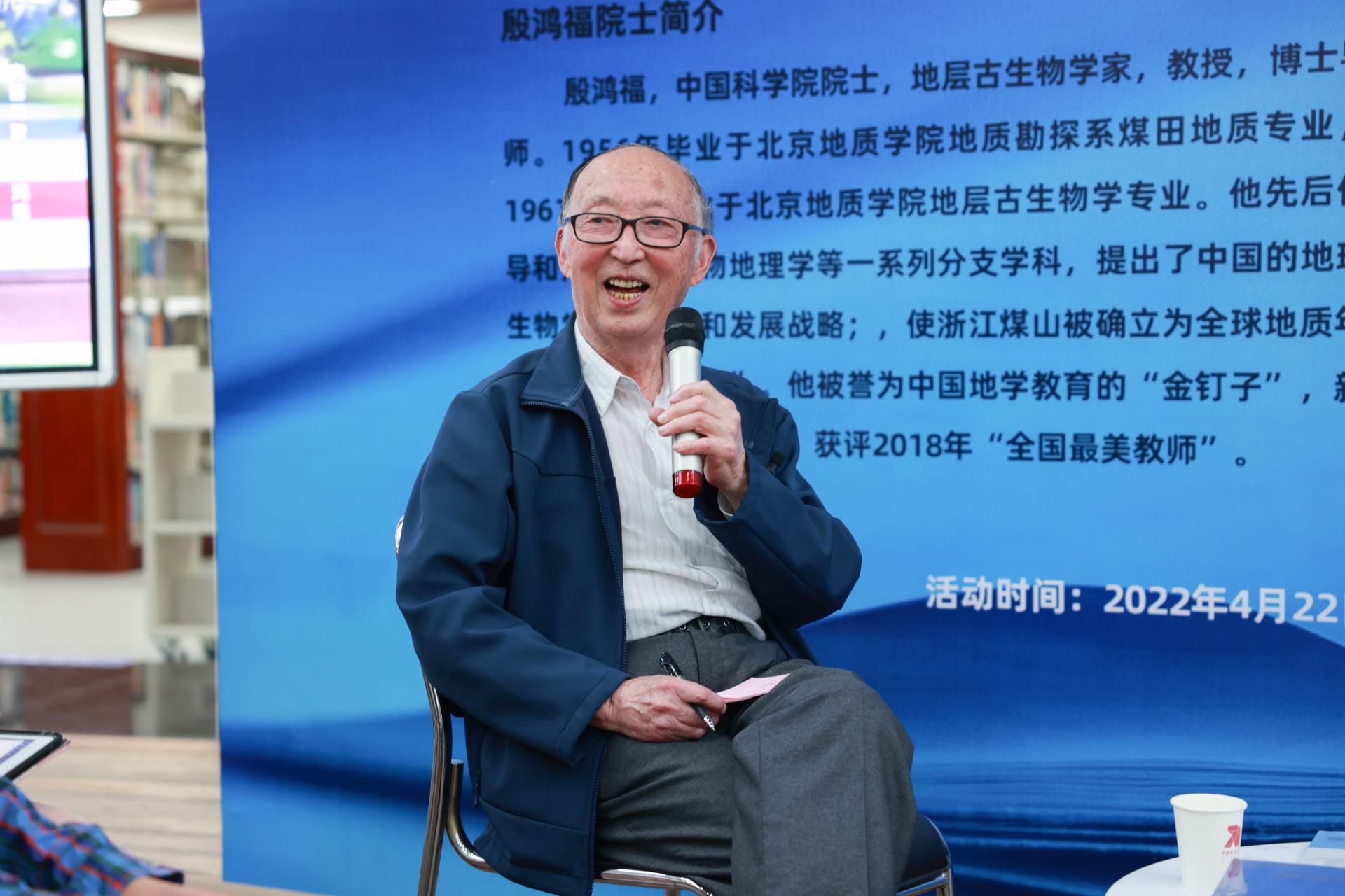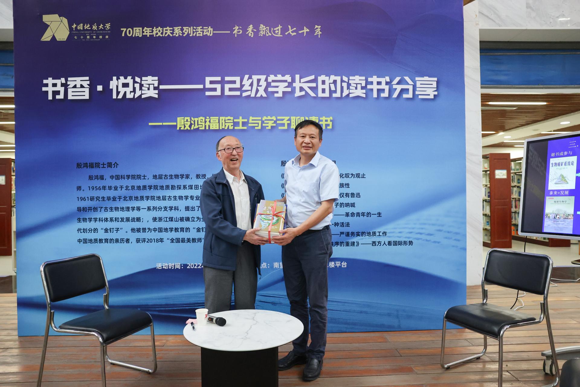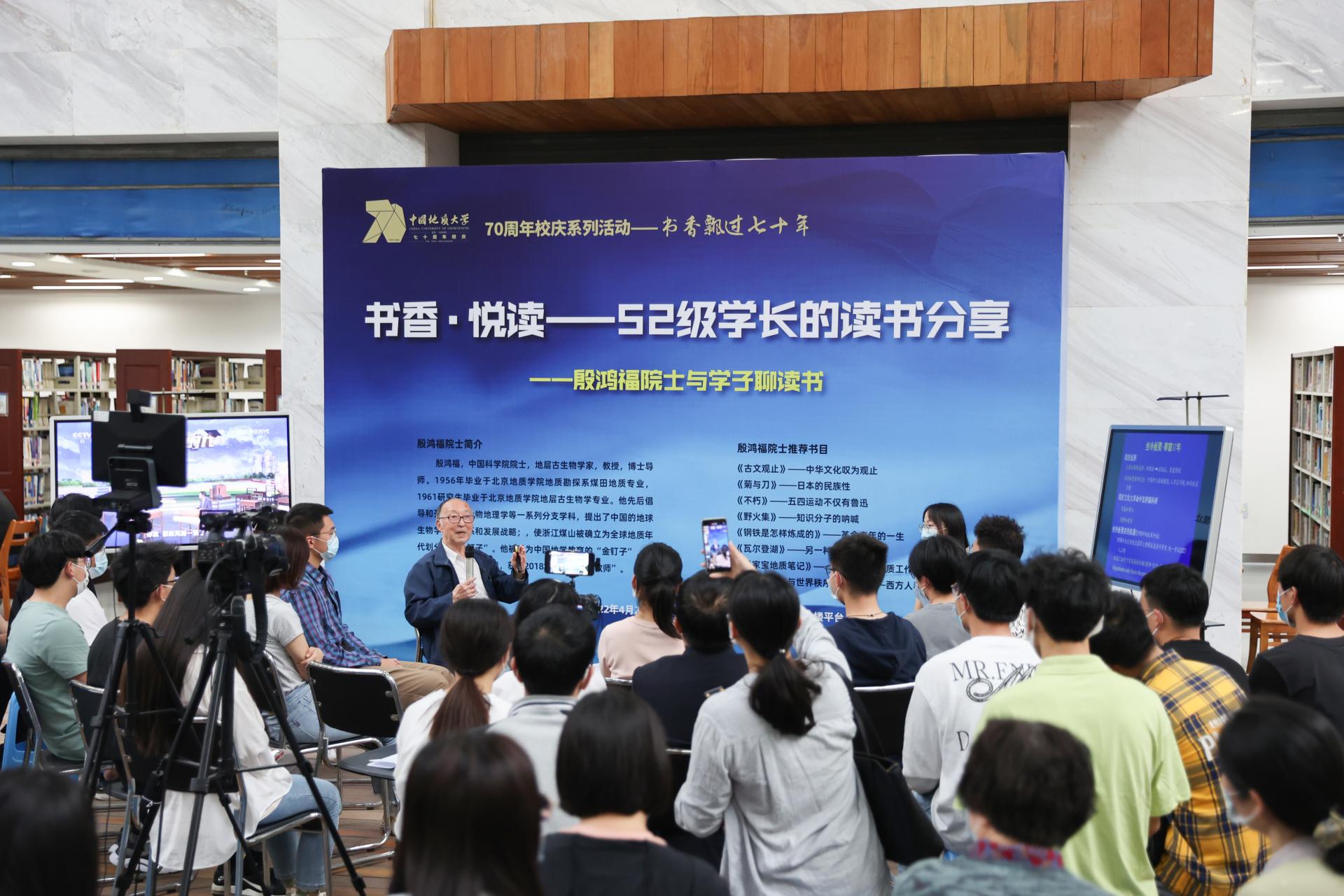 在“书香飘过70年”校庆主题阅读推广第一期活动中,殷鸿福院士以《读书改变我的人生》为题做读书分享,结合自己70多年的读书、学习、工作经历,从读书带来机遇、读书探索道路、读书培养人才三个方面,与学生代表分享了读书心得。