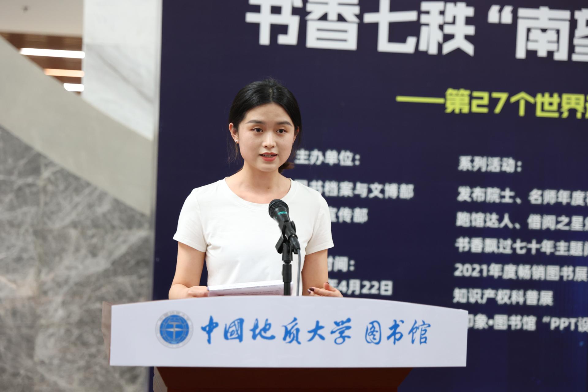 图书馆首任学生馆长、经济管理学院2020级研究生牛烨荧宣读阅读倡议书。她号召全体同学积极行动起来,多读书、读好书,让阅读成为一种爱好,传承地大精神,用书香涤荡心灵,让地大弥漫书香。