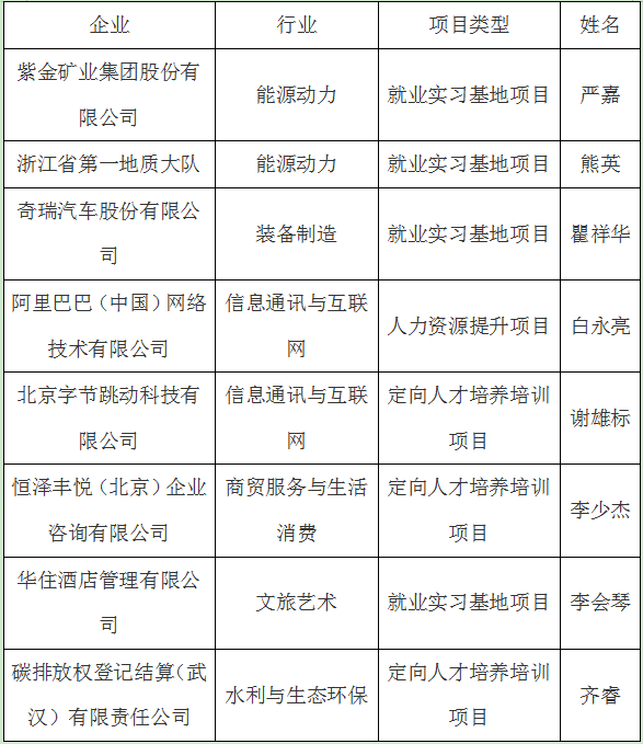 地大新闻网讯(通讯员 刘志兴 彭鑫 郭玉凤)近日,教育部高校学生司发布了《关于公布第一期供需对接就业育人项目立项名单的通知》,我校共有8个项目获批立项,合作用人单位包含紫金矿业集团股份有限公司、阿里巴巴(中国)网络技术有限公司、浙江省第一地质大队、奇瑞汽车股份有限公司等8个单位,涉及能源动力、装备制造、信息通讯与互联网、水利与生态环保等6个行业。