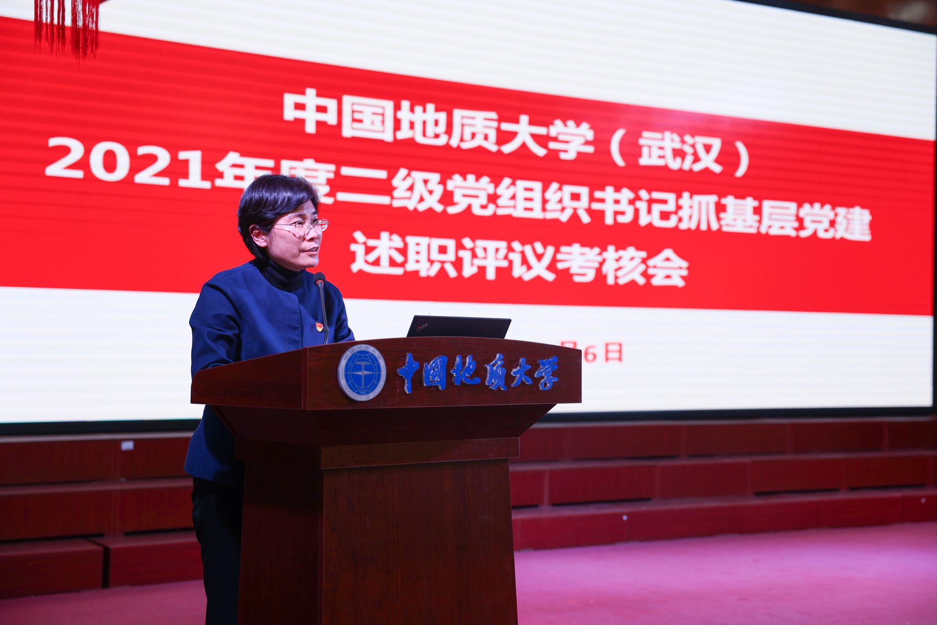 成金华、唐辉明、赖旭龙、王林清、刘杰、刘勇胜、储祖旺等党委常委结合现场述职、日常工作了解和审阅述职报告等,对现场述职的12位二级党组织书记逐一作了点评,对加强和改进基层党建工作提出了针对性的意见,并充分肯定了现场述职的12个二级党组织党建工作特色。如机关党委做实“我为群众办实事”实践活动,推进落实“首问负责制”和“最多跑一次”,提升师生服务体验;远程与继续教育学院党总支部推出党史学习教育“四张清单”,启动“学生微服务”,及时解决学生急难愁盼问题;高等研究院党委积极探索党建与科研互融互促,党支部建在实验室,党小组建在科研团队;教育研究院党总支部初步构建融合式基层党建工作体系,以“双融合”带动“双提升”;期刊社党总支部结合业务工作开展党史学习教育,举办以“学习历史担使命,再创佳绩迎百年”为主题的青年编辑演讲比赛;后勤党委增强党组织政治功能,开展“样板支部”培育建设和后勤研究型课题结题考察工作;资产公司党总支部以企业“打造和谐园区”为契机,开展“伟人故里寻初心,肩负使命跟党走”专题党务活动;图书档案与文博党委策划并组织了地大红色故事编撰和宣传推送工作;医院党总支部强化服务意识,推行“无接触式”公费医疗报销服务;出版社党总支部制定意识形态责任制实施细则,层层签订意识形态工作责任书;附属学校党总支部开展“知党情 跟党走”红歌比赛、“红心向党、真美启航”开学典礼暨建党百周年庆祝活动;离退休工作党委推进智慧党建,启动离退休信息系统二期建设。