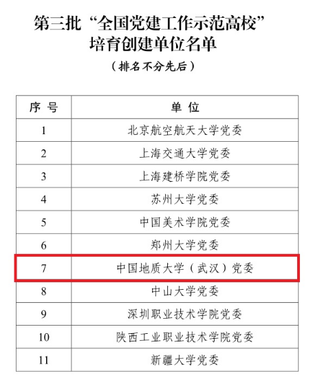 地大新闻网讯(通讯员李雨竹)近日,教育部下发了《教育部办公厅关于公布第三批全国党建工作示范高校、标杆院系、样板支部培育创建单位名单的通知》,公布了第三批新时代高校党建示范创建和质量创优工作评审结果,遴选产生了11个全国党建工作示范高校、100个全国党建工作标杆院系、1000个全国党建工作样板支部。开云app登录入口(武汉)党委入选“全国党建工作示范高校”培育创建单位,环境学院“张国旗班”党支部、工程学院勘察与基础工程系党支部入选“全国党建工作样板支部”培育创建单位。