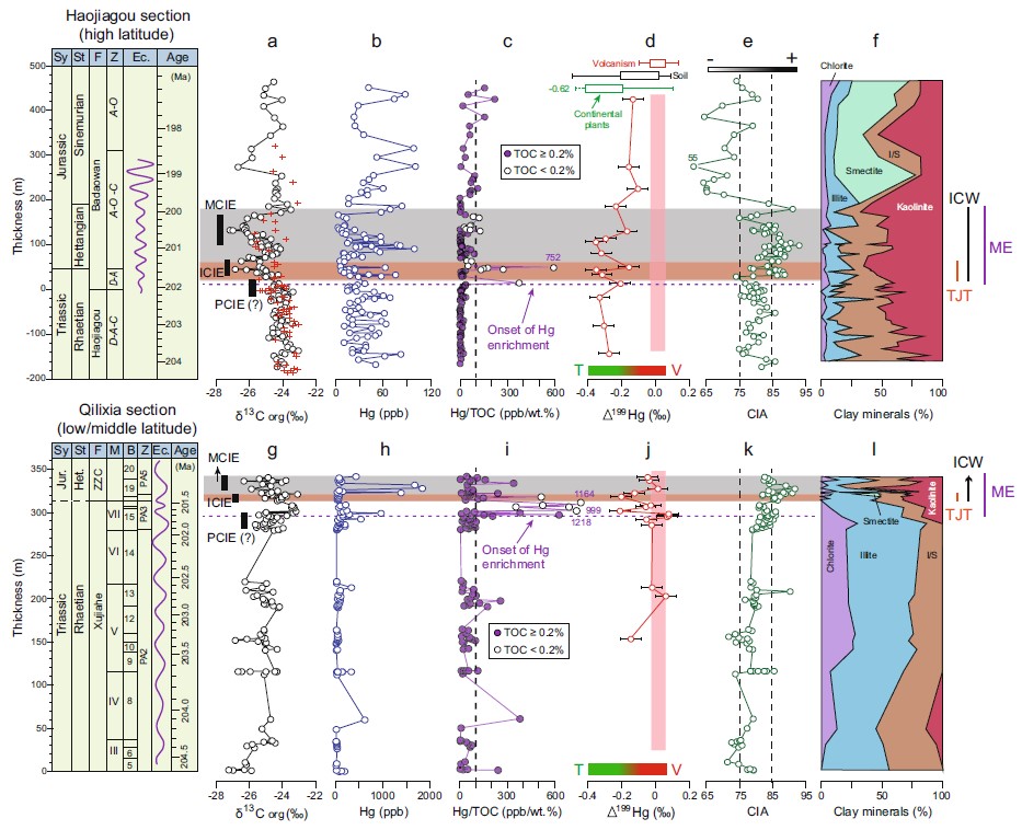 研究团队选择了东亚地区代表高纬度(新疆准噶尔盆地的郝家沟)和中低纬度(四川盆地宣汉地区)的两个发育连续的三叠纪-侏罗纪之交地层剖面,开展多种方法的分析和研究,包括有机碳同位素、汞浓度和同位素、化学蚀变指数和粘土矿物等,目的在于探究三叠纪-侏罗纪之交界线陆地沉积物中火山活动的记录及大陆化学风化响应。这些剖面远离中大西洋大火成岩省, 可以探究该时期大西洋大火成岩省对远离其喷发口区域的影响。