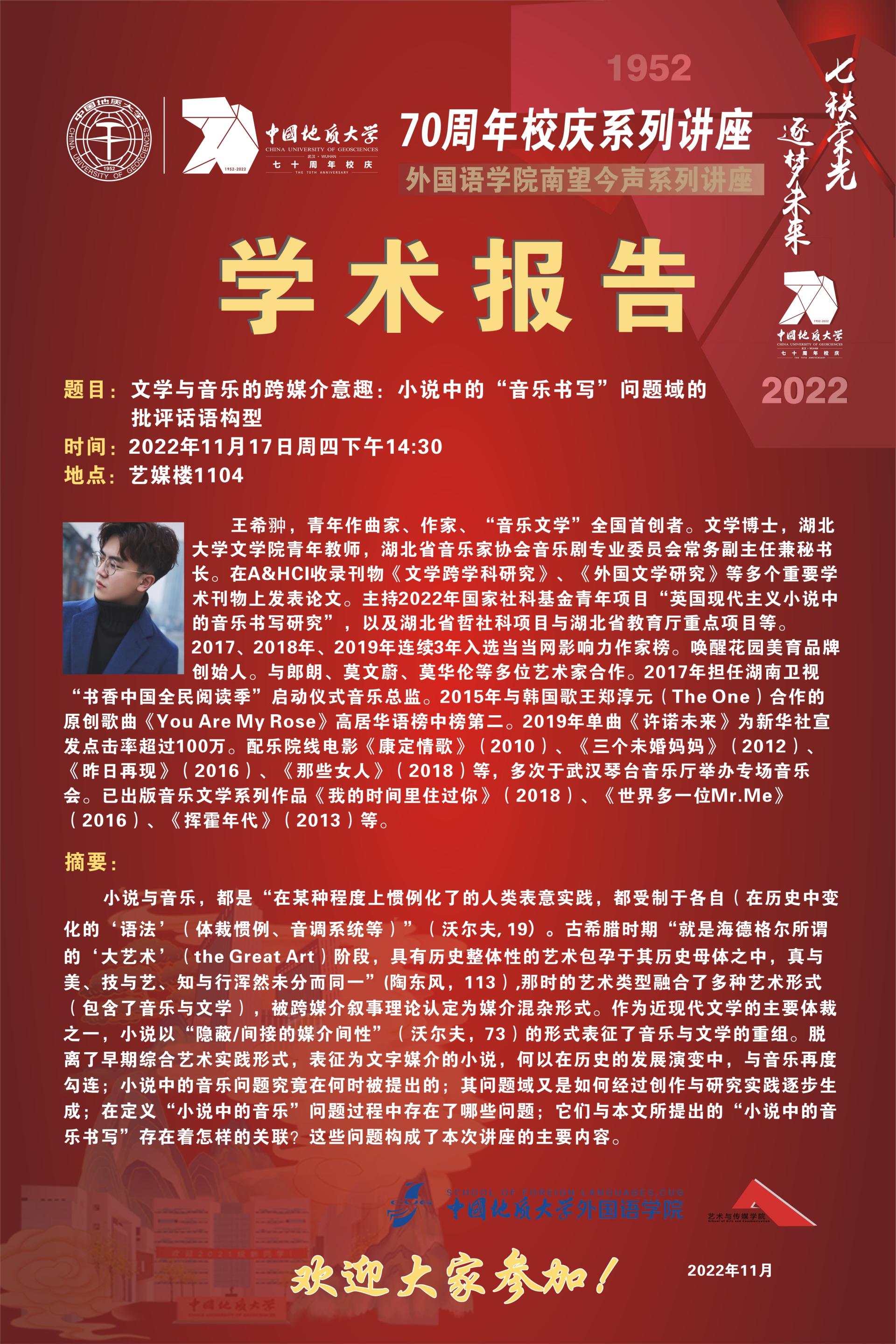 【11月17日】“南望今声”外语系列讲座:湖北省音乐家协会音乐剧专业委员会常务副主任王希翀的学术报告